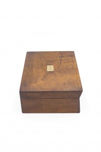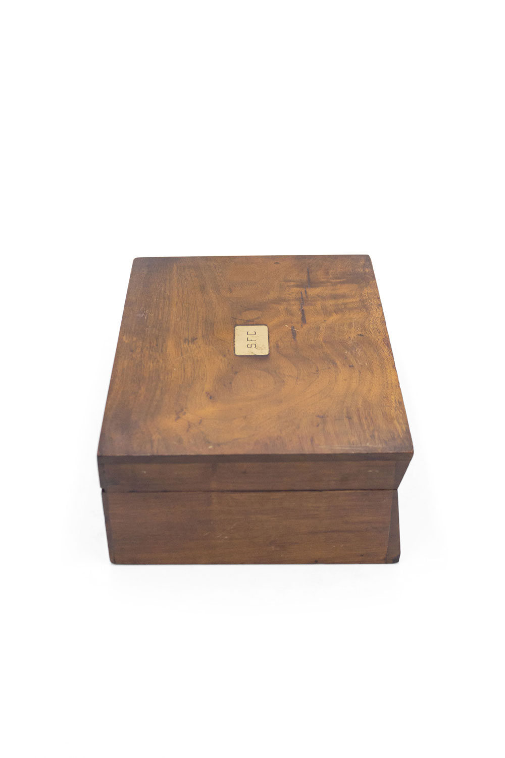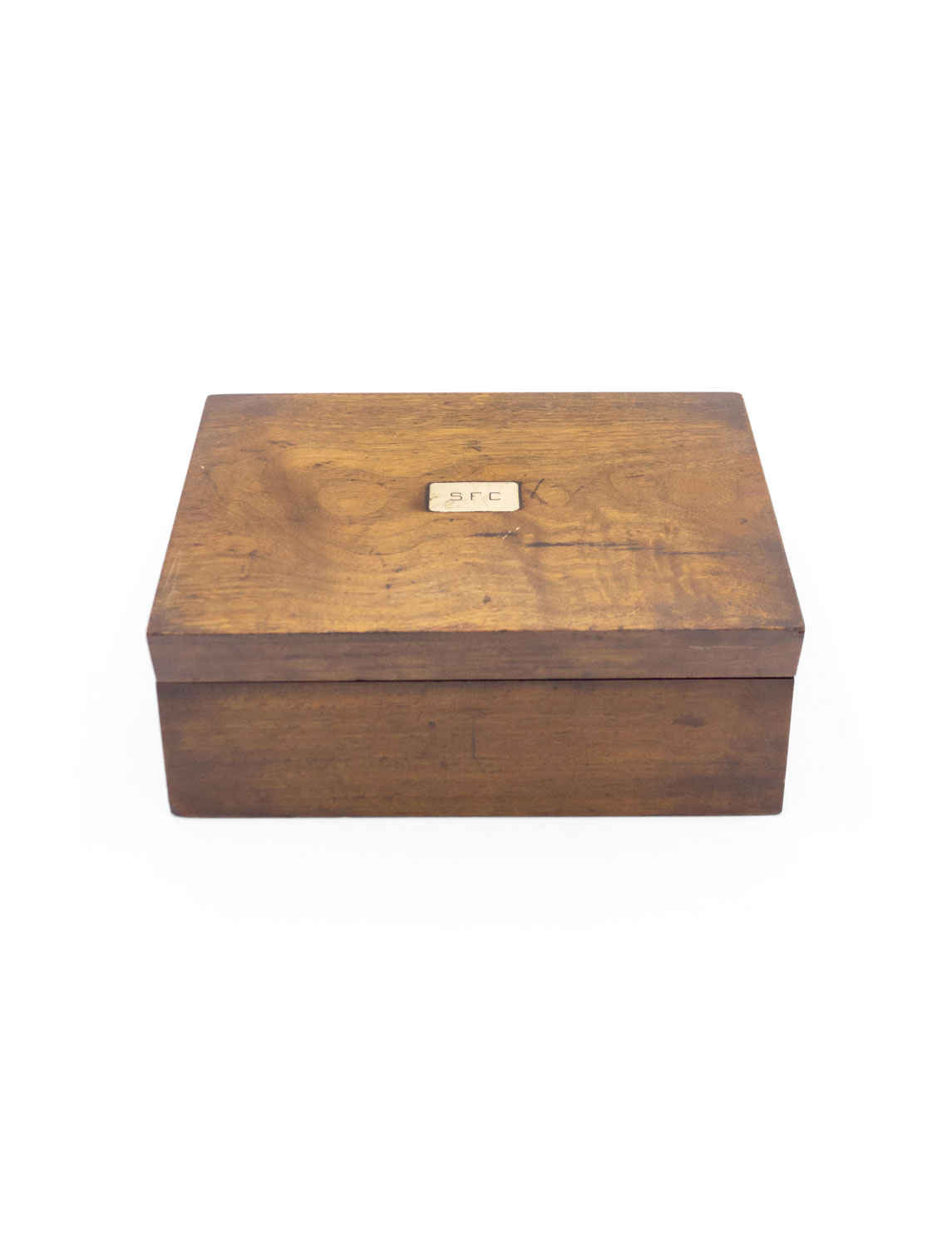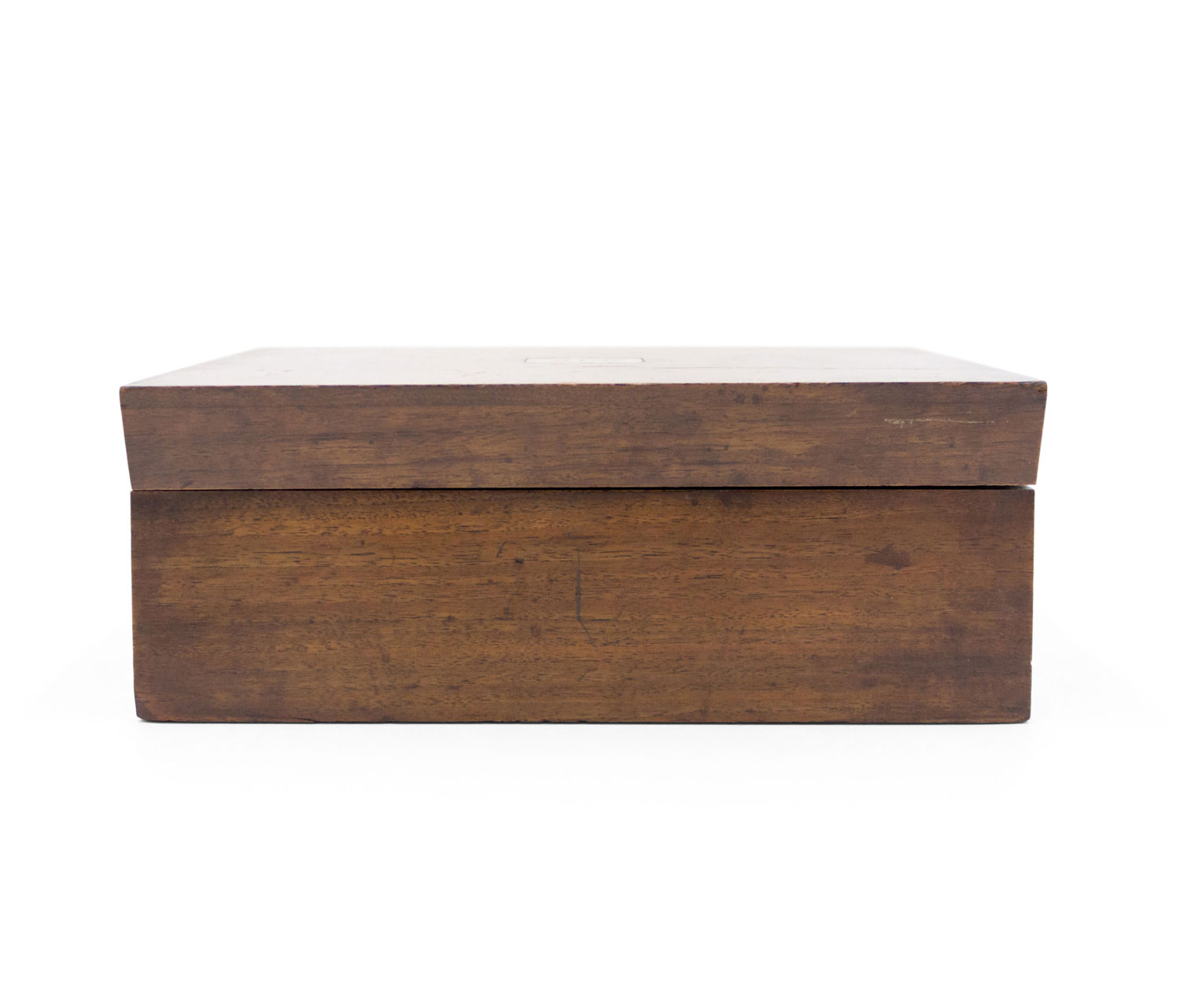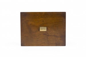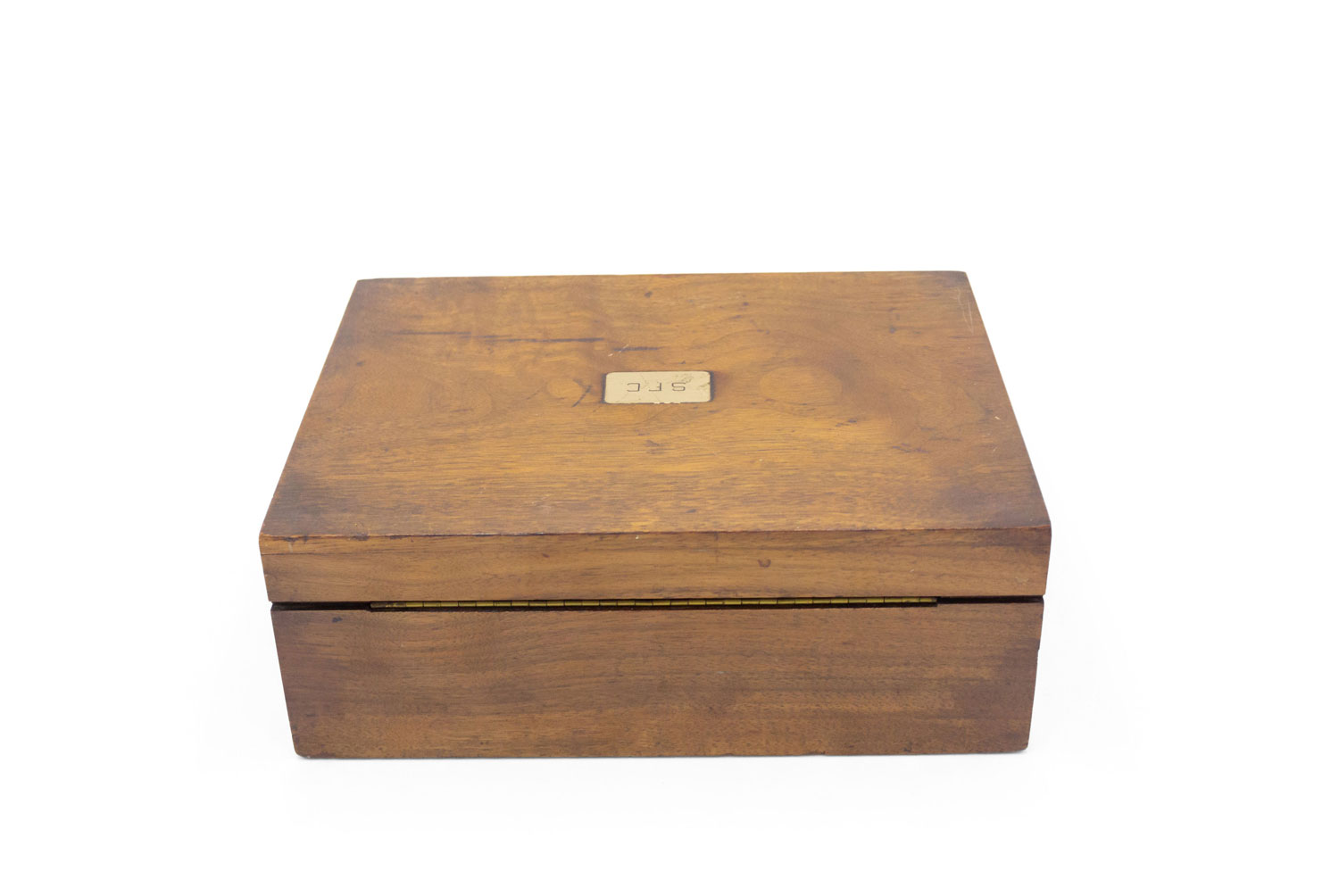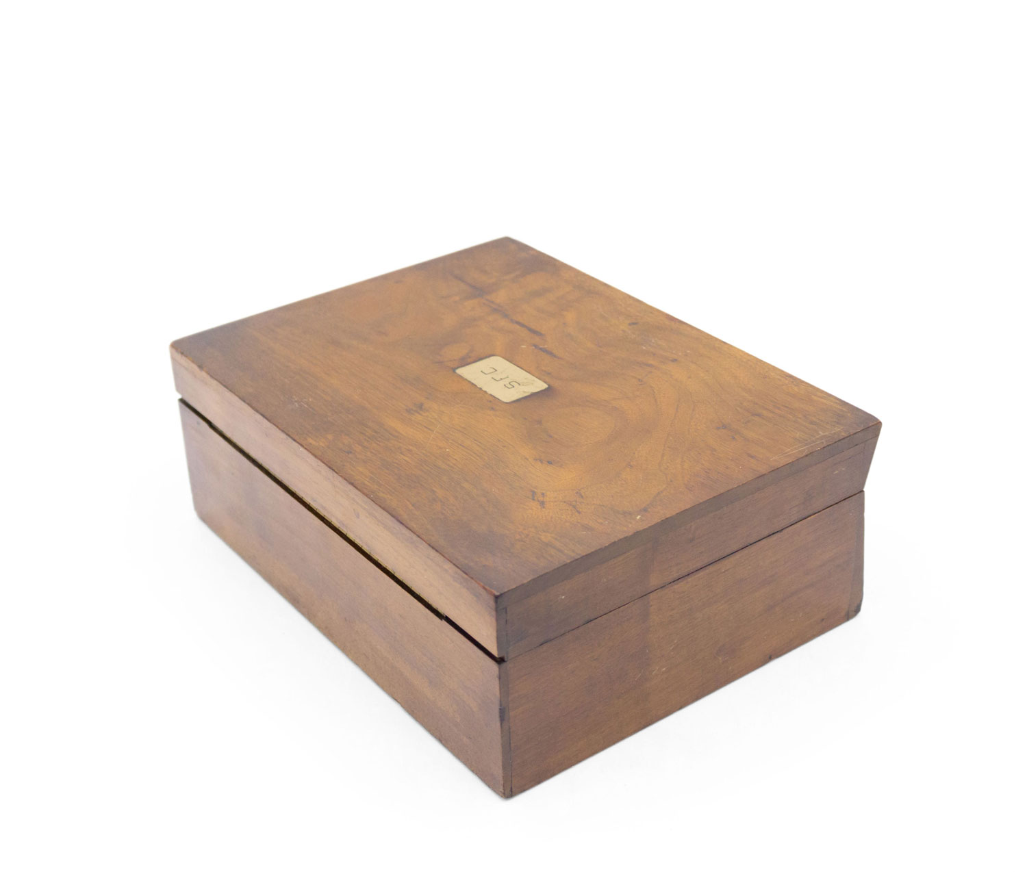 English Victorian rectangular rosewood box with rectangular brass inlaid plaque on slanted top lid with the initials S.F.C..