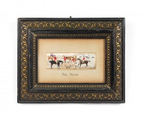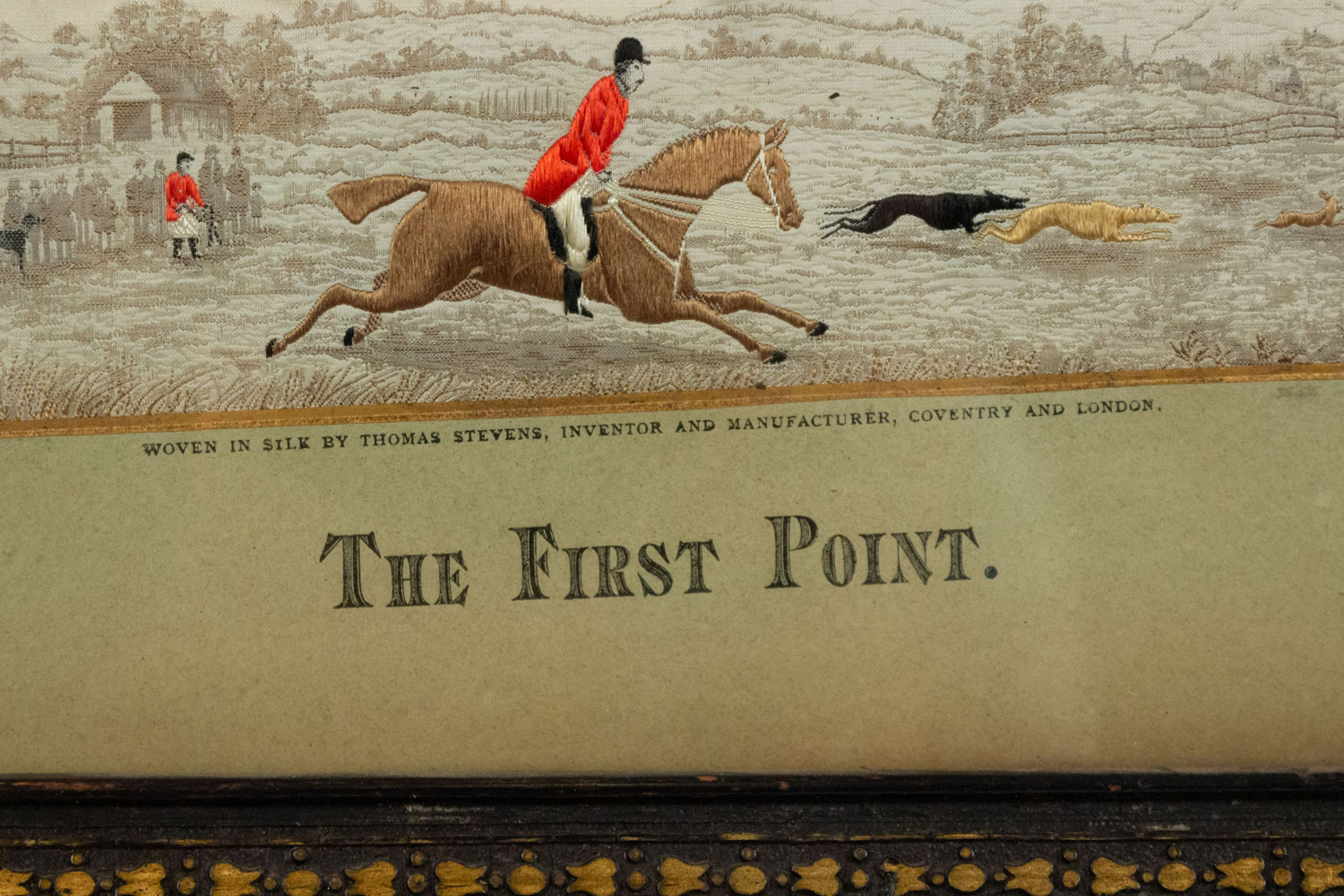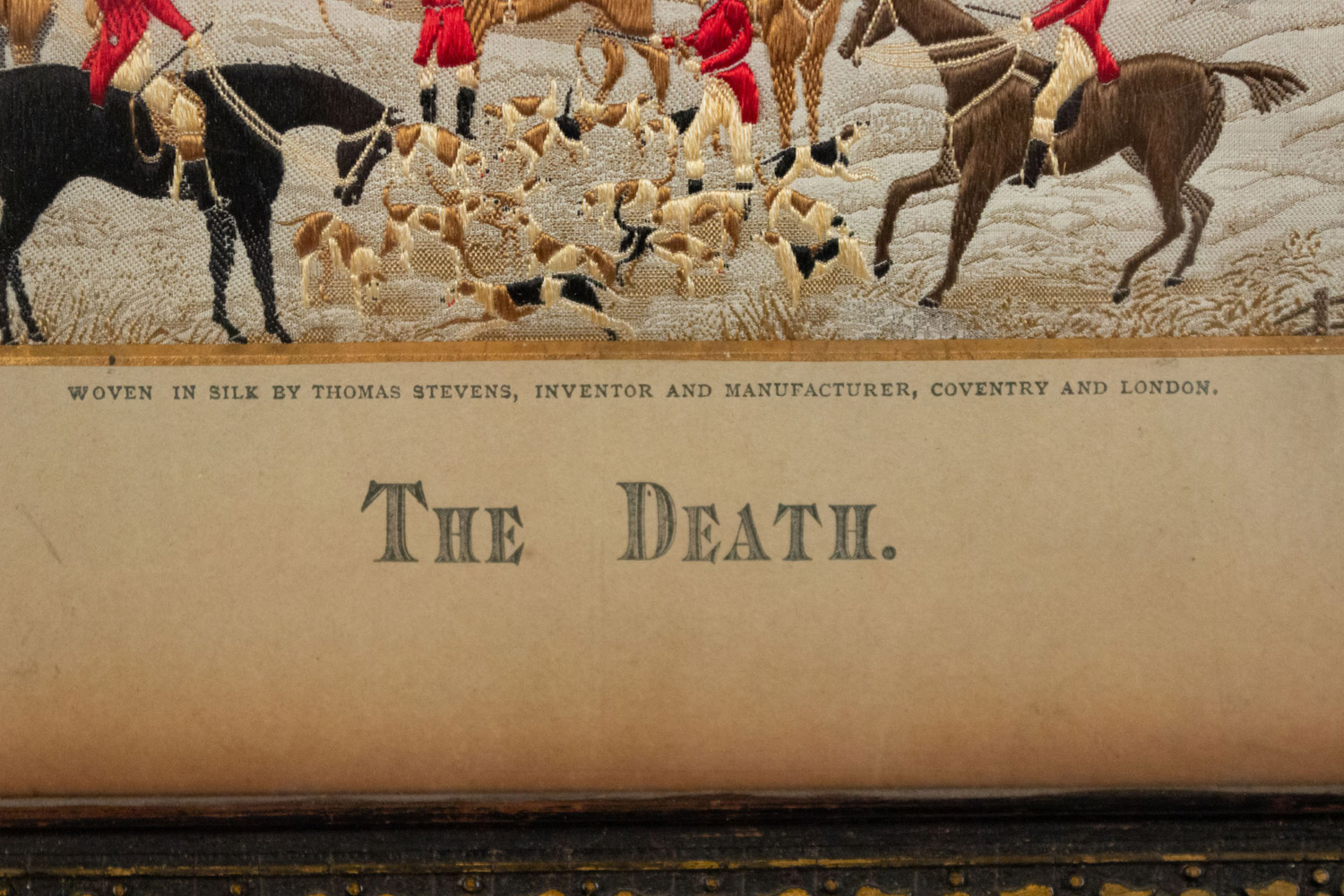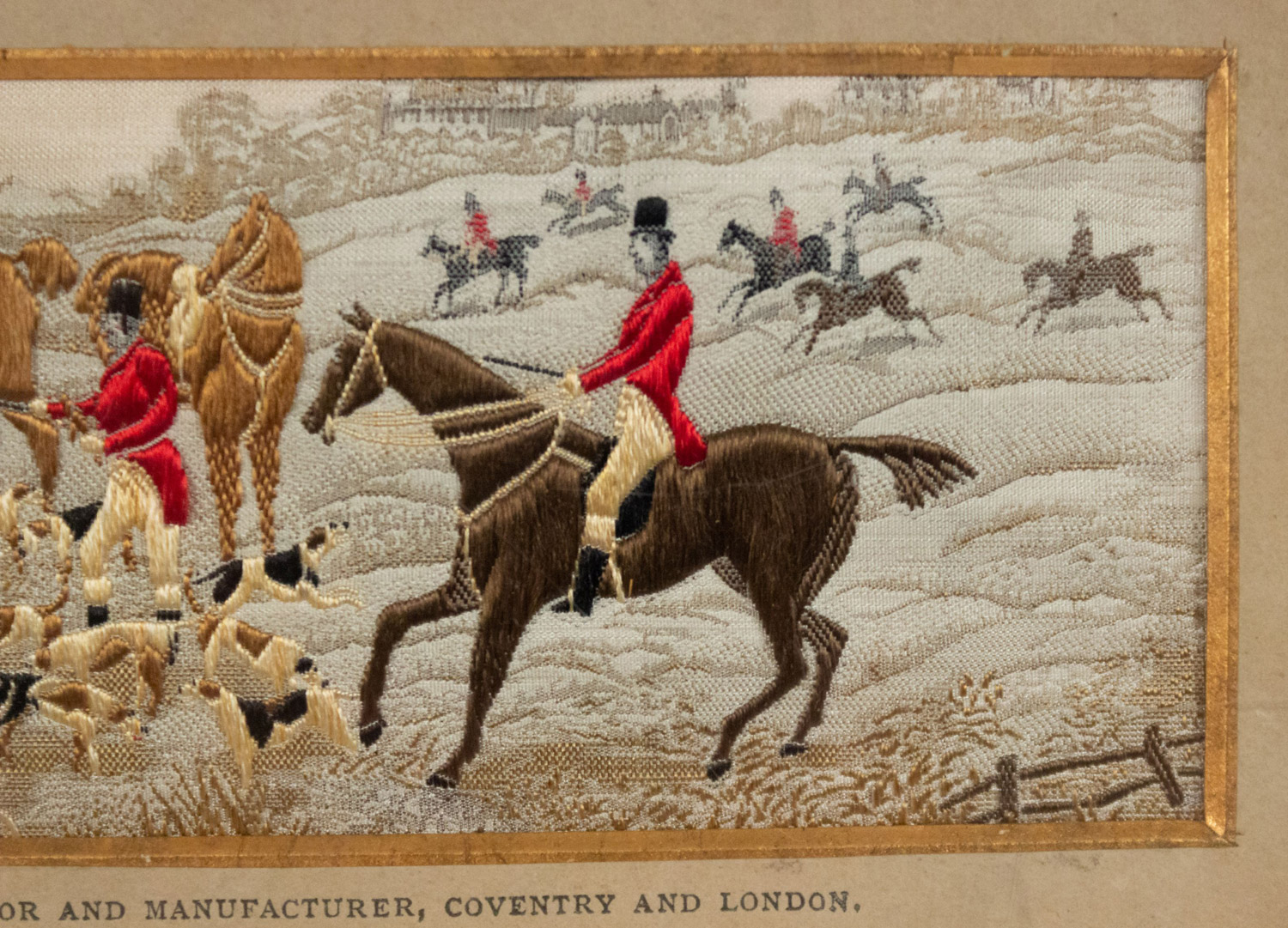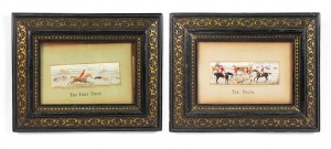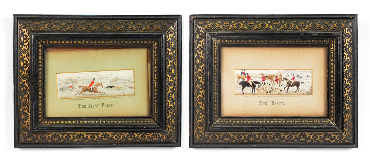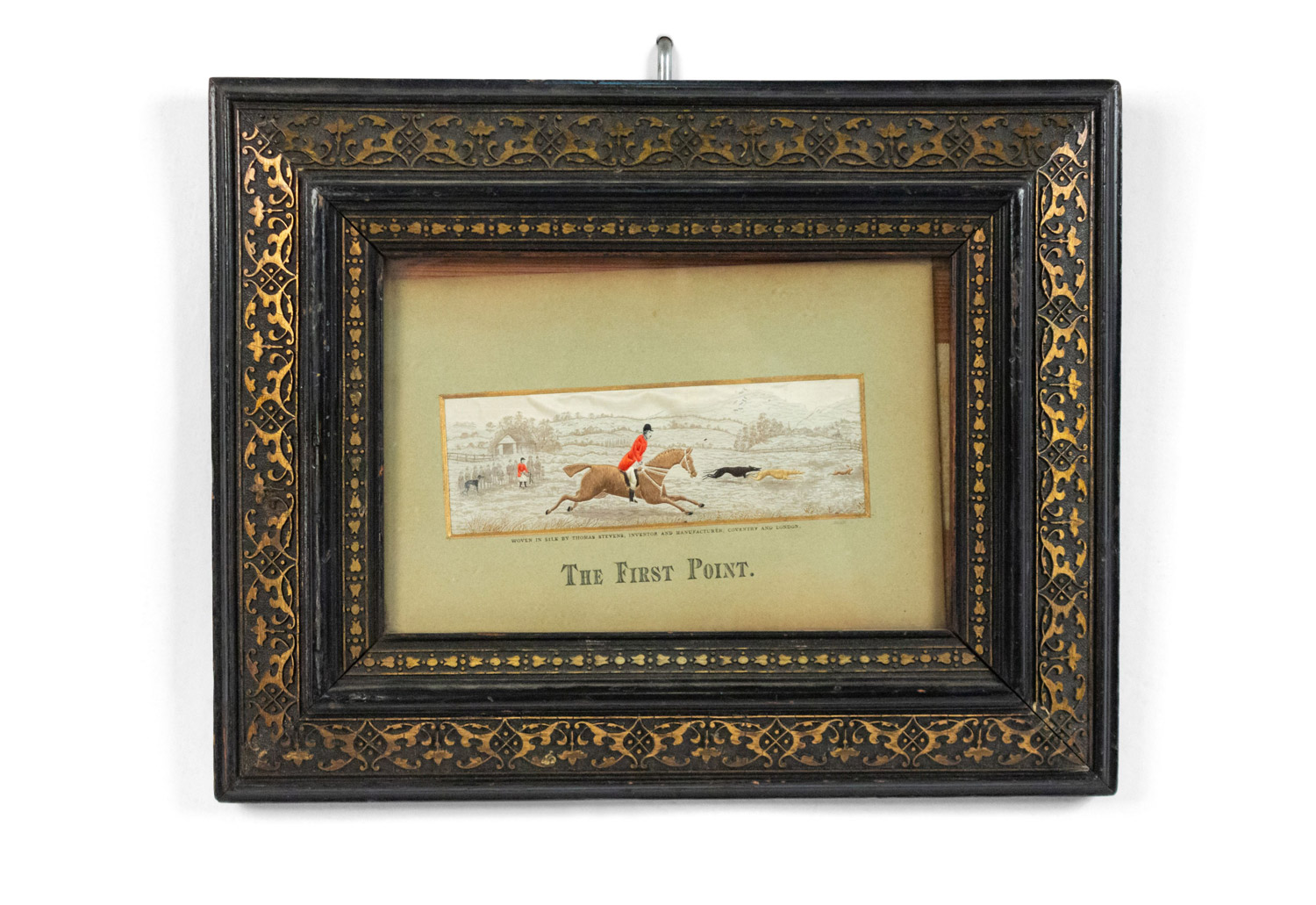 PAIR of English Victorian silk embroidered hunting scenes in ebonized and gilt frames (Stevens) (PRICED AS PAIR)