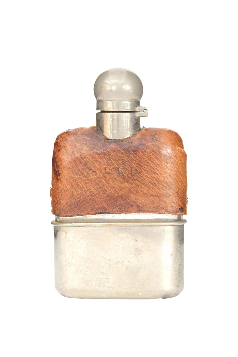 English Victorian style vintage glass flask with a silver plate base and a brown leather cover. Initials "L.L.H."..