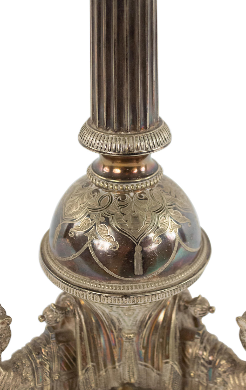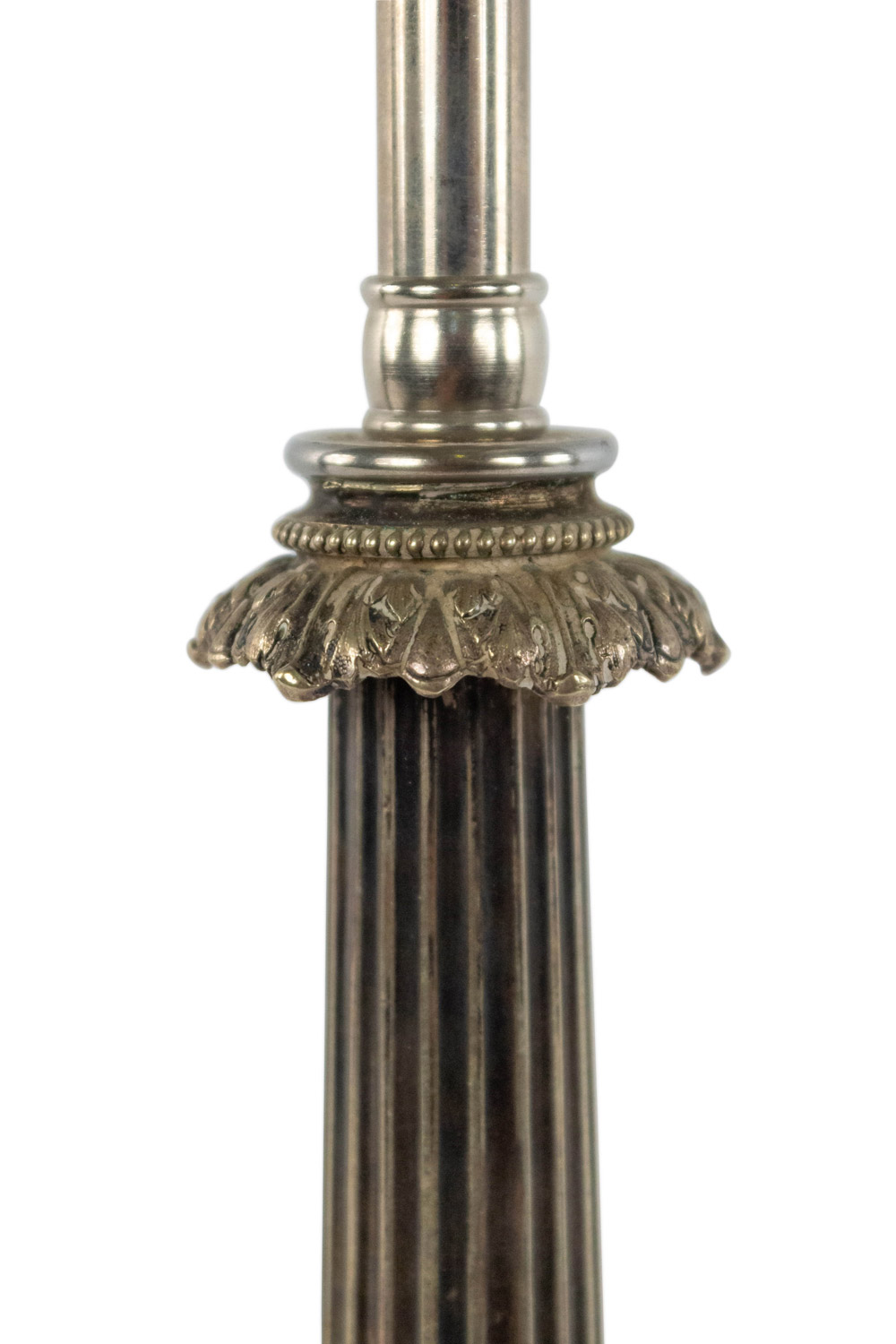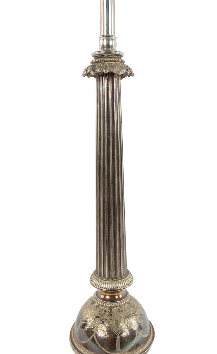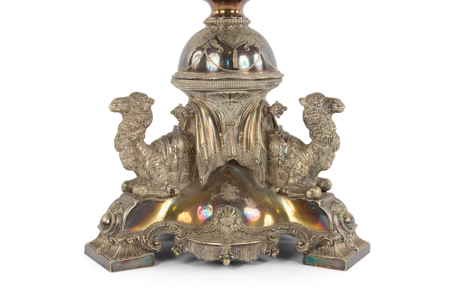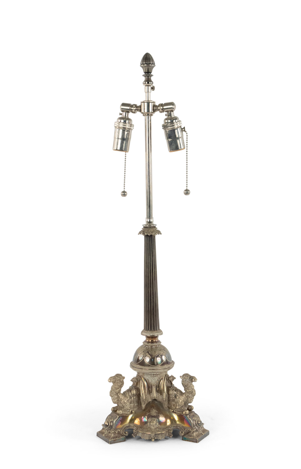English Victorian (dated 1865) silver plated table lamp with camels kneeling on a tripartite base beneath a fluted columnar shaft..