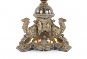 English Victorian (dated 1865) silver plated table lamp with camels kneeling on a tripartite base beneath a fluted columnar shaft.