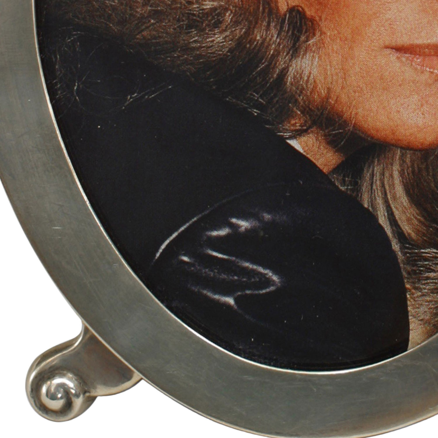 English Victorian sterling silver oval easel picture frame resting on 2 simple scroll feet with a dark blue velvet backing..