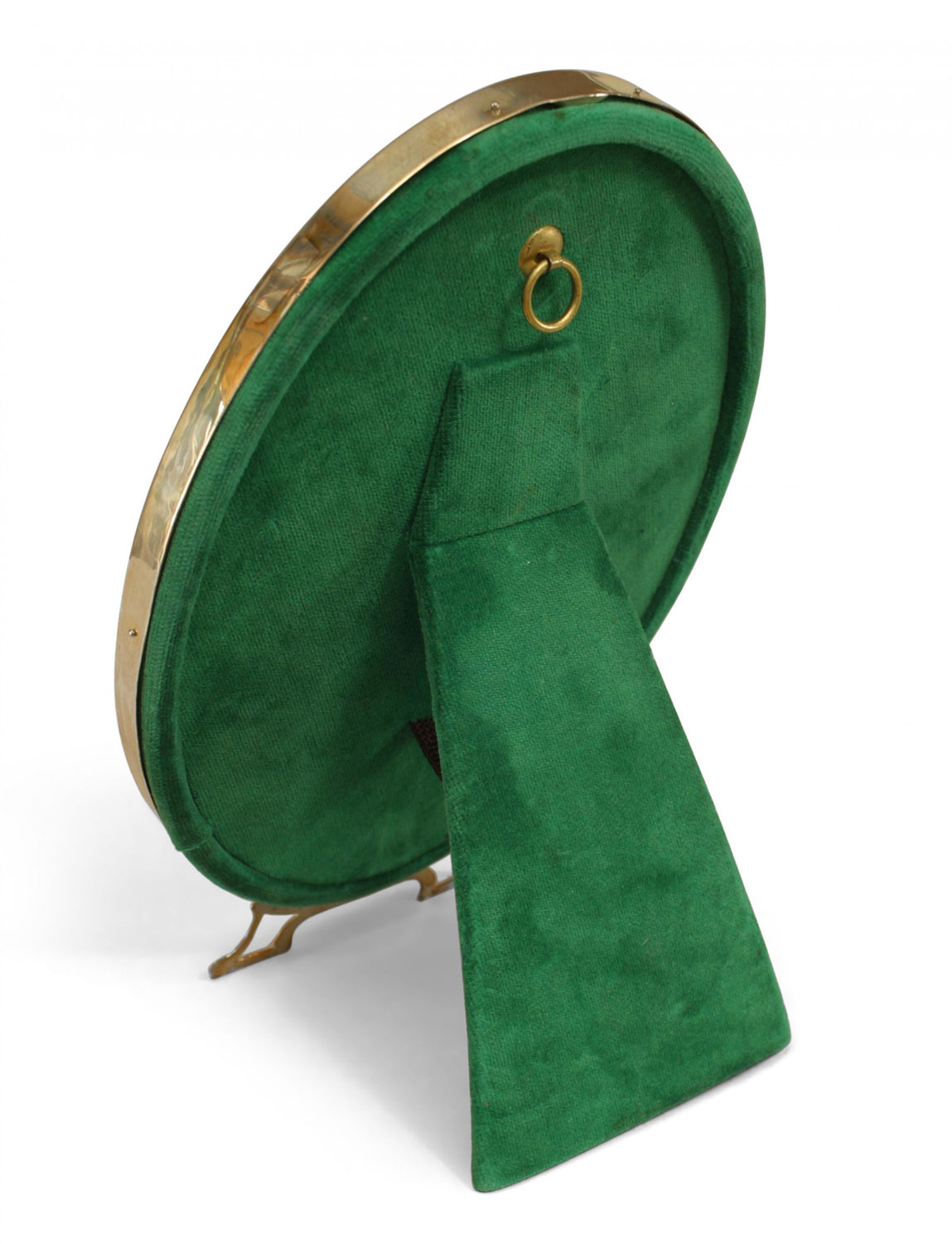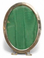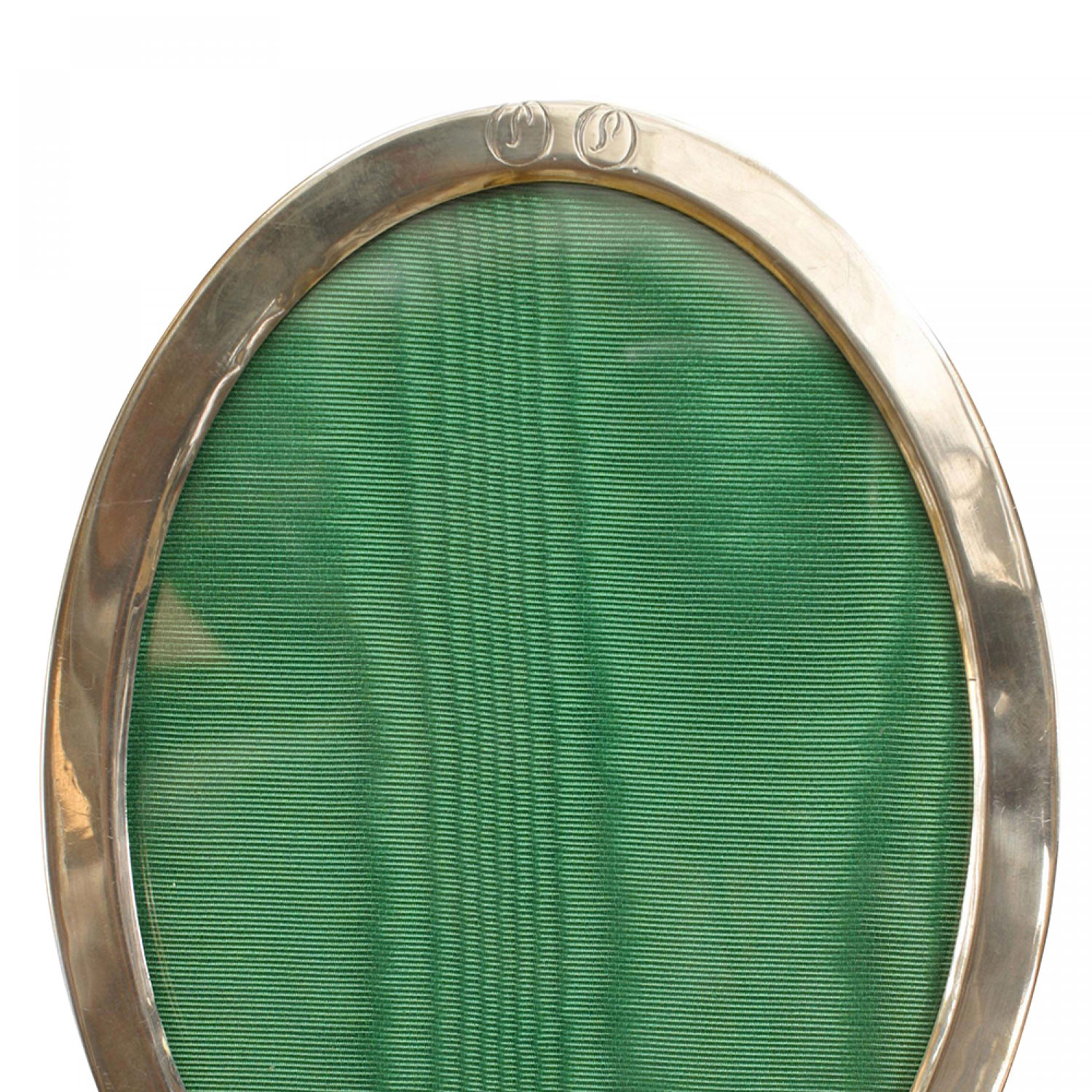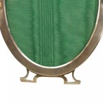 English Victorian-style sterling silver simple oval easel picture frame with open design on feet and 2 engraved initials in circles on top with green velvet backing..