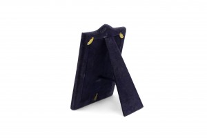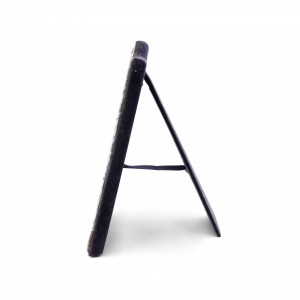 English Victorian-style silver easel picture frame with scroll design and shaped top..