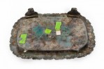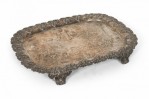 English Victorian rectangular silver-plate tray on 4 small legs with leaf edges and etched surface.