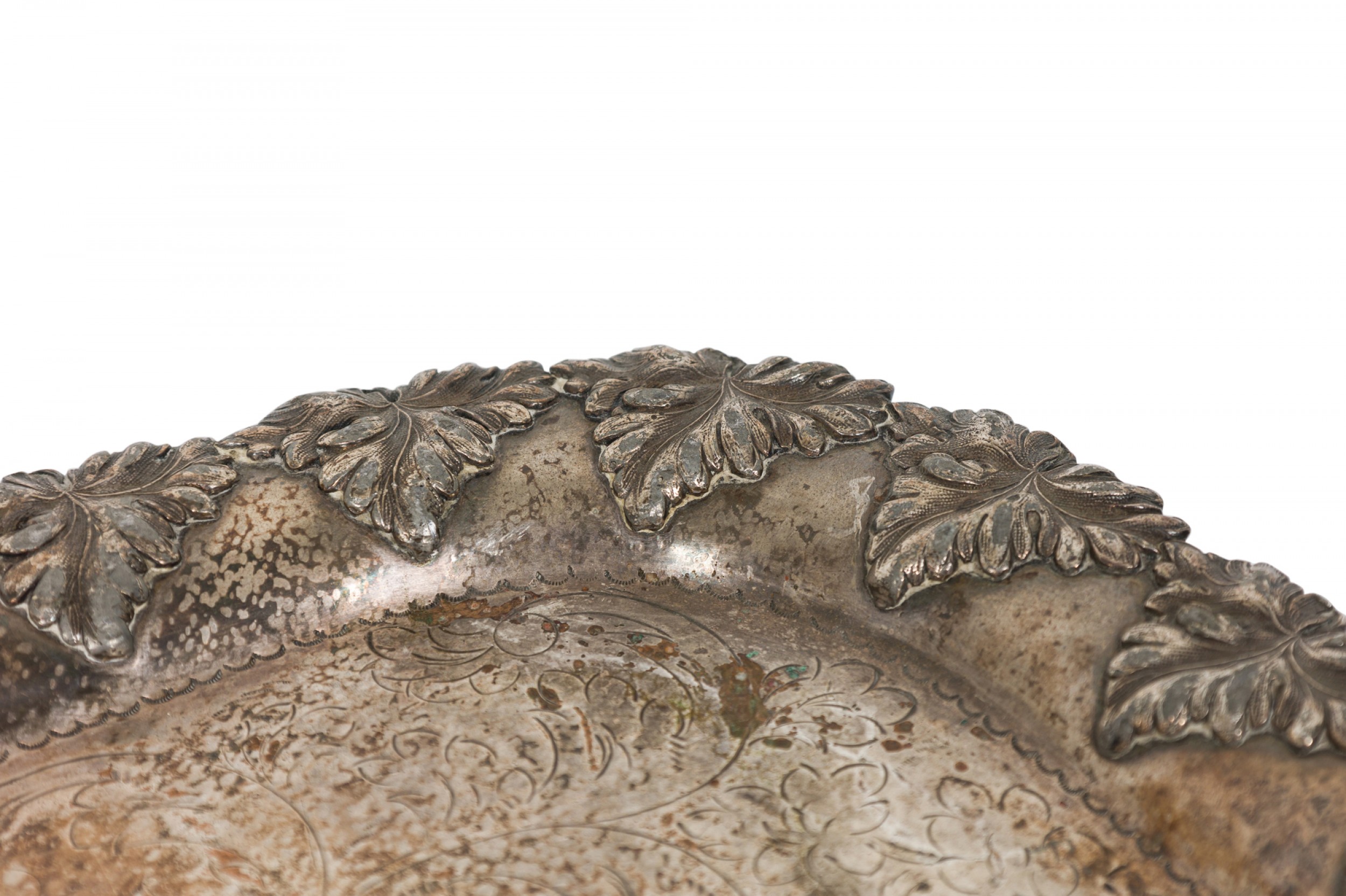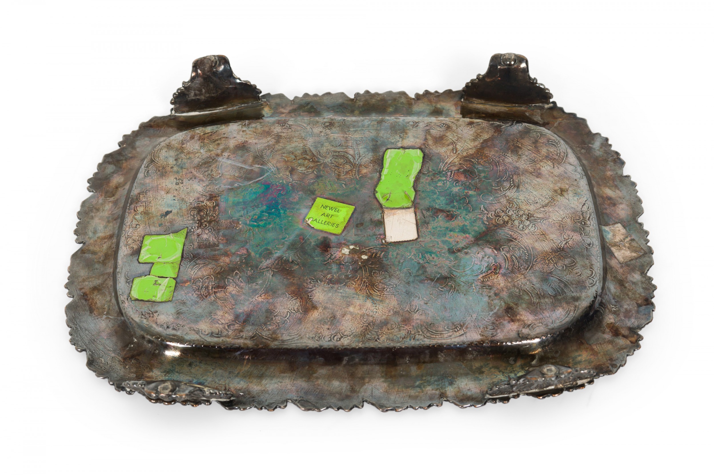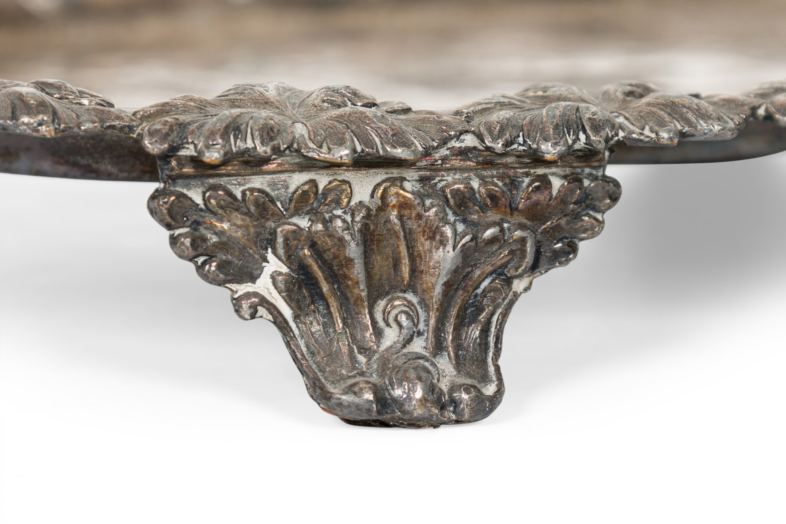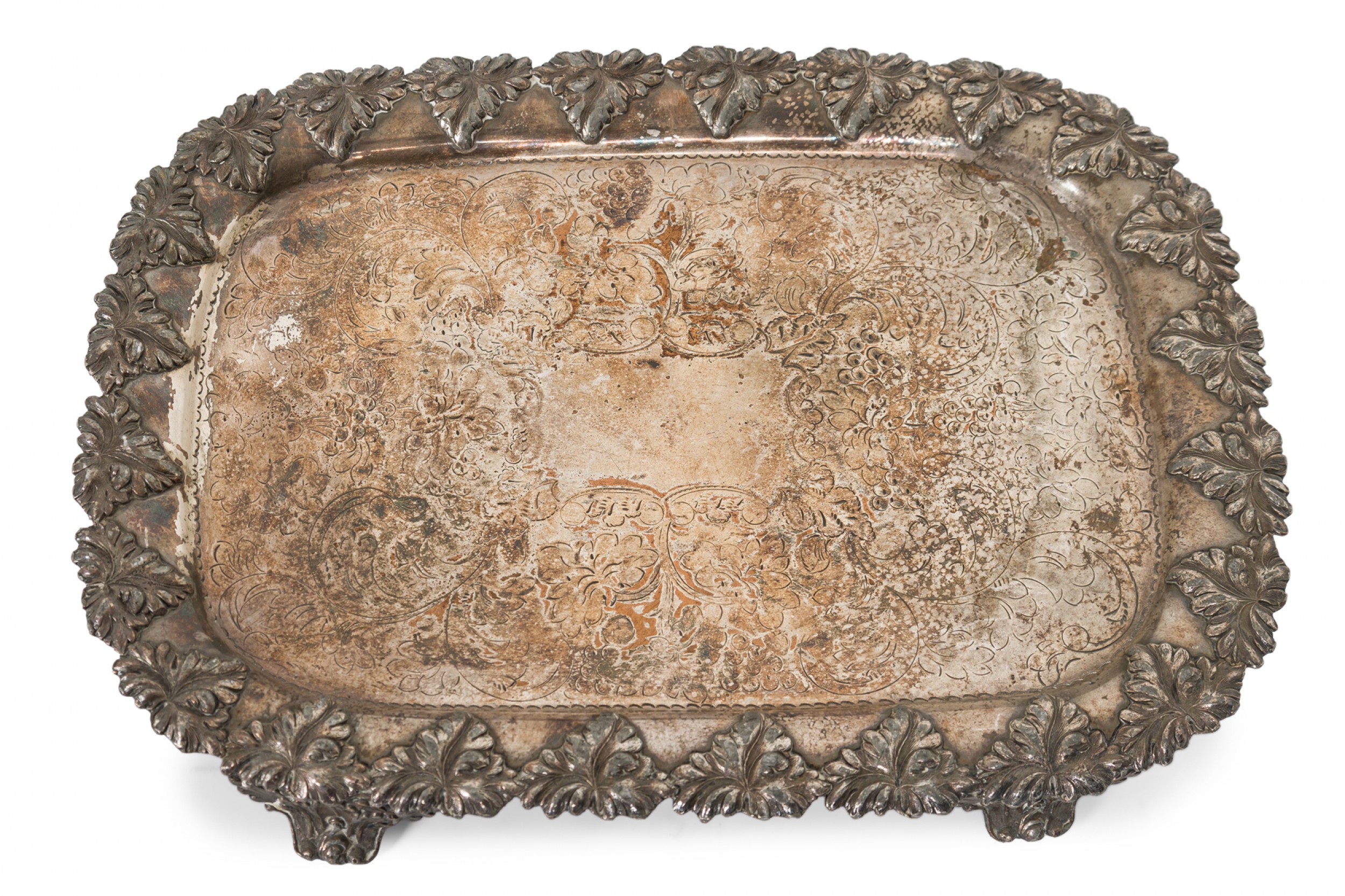 English Victorian rectangular silver-plate tray on 4 small legs with leaf edges and etched surface