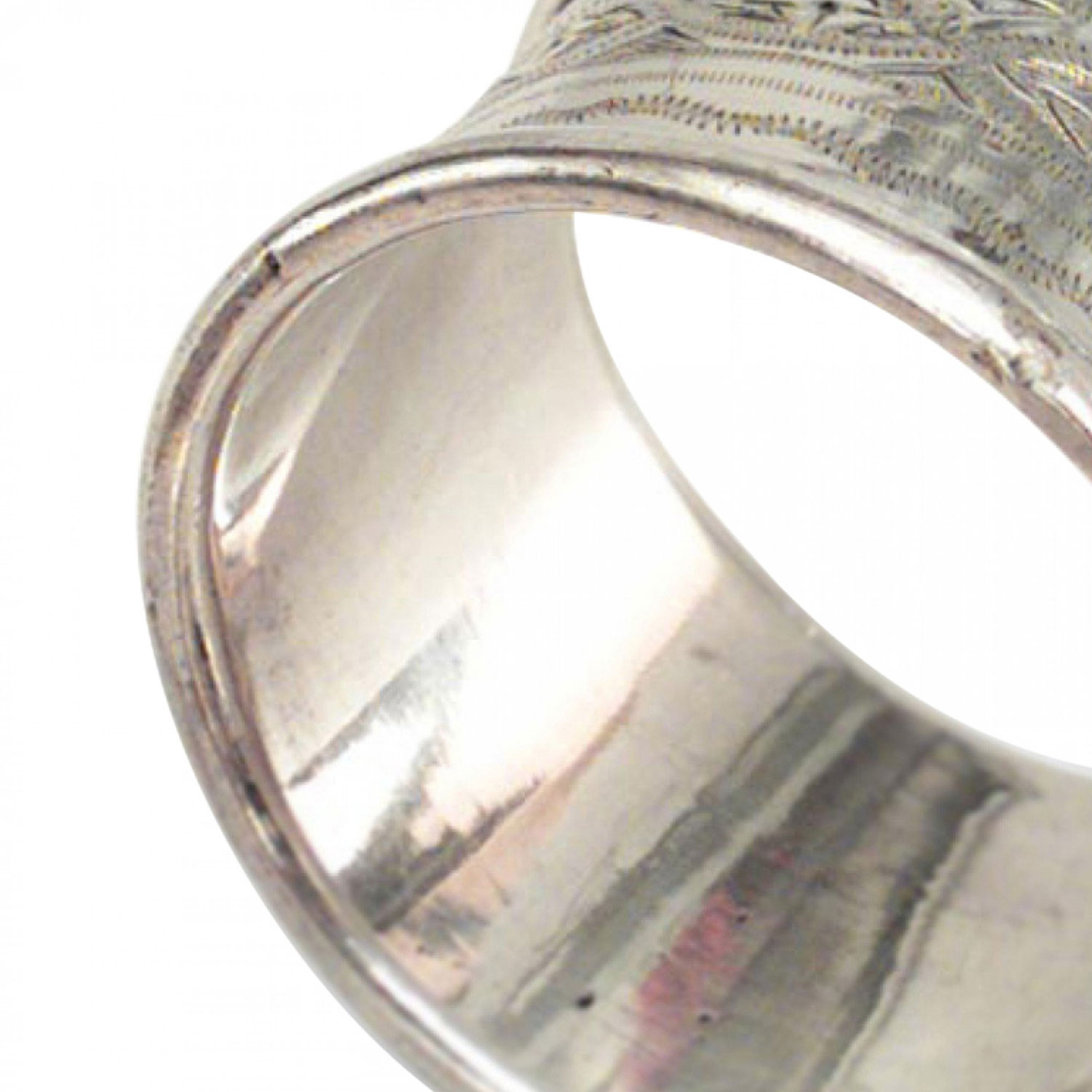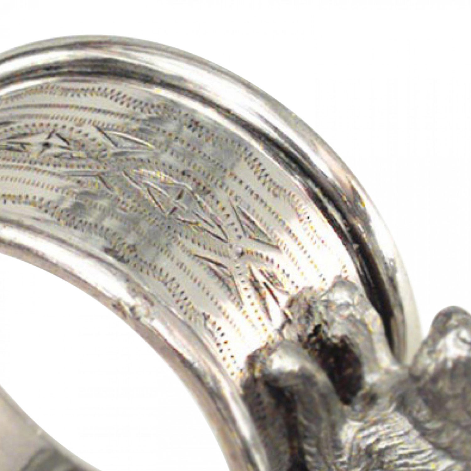 English Victorian silver plate napkin ring with etched design and dog on hind legs