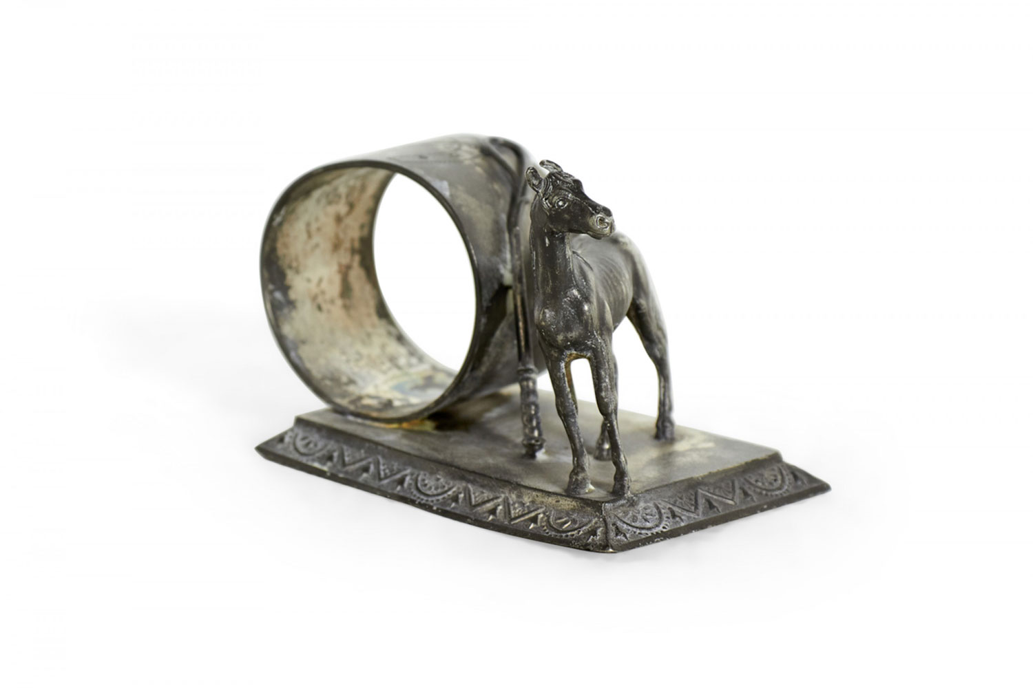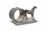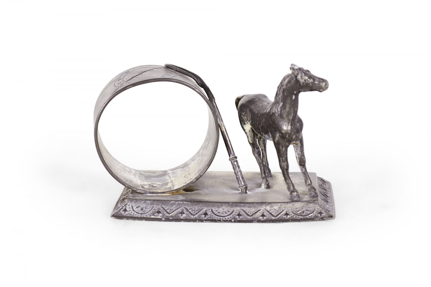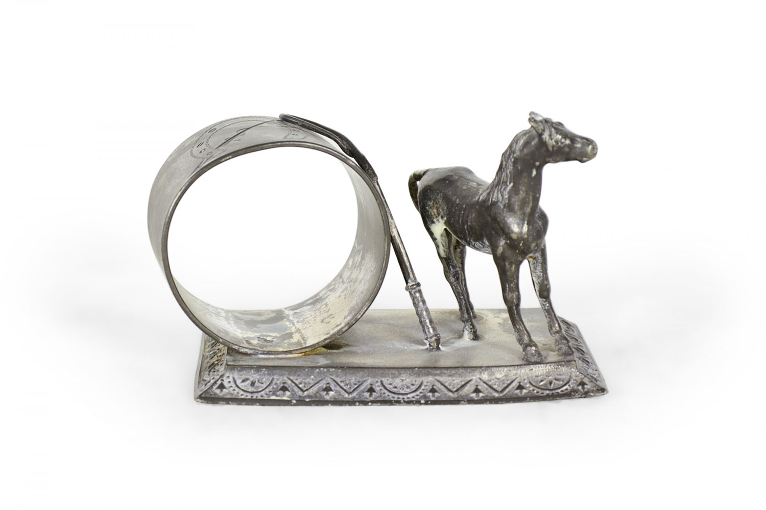 English Victorian silver plate napkin ring with horse and whip.