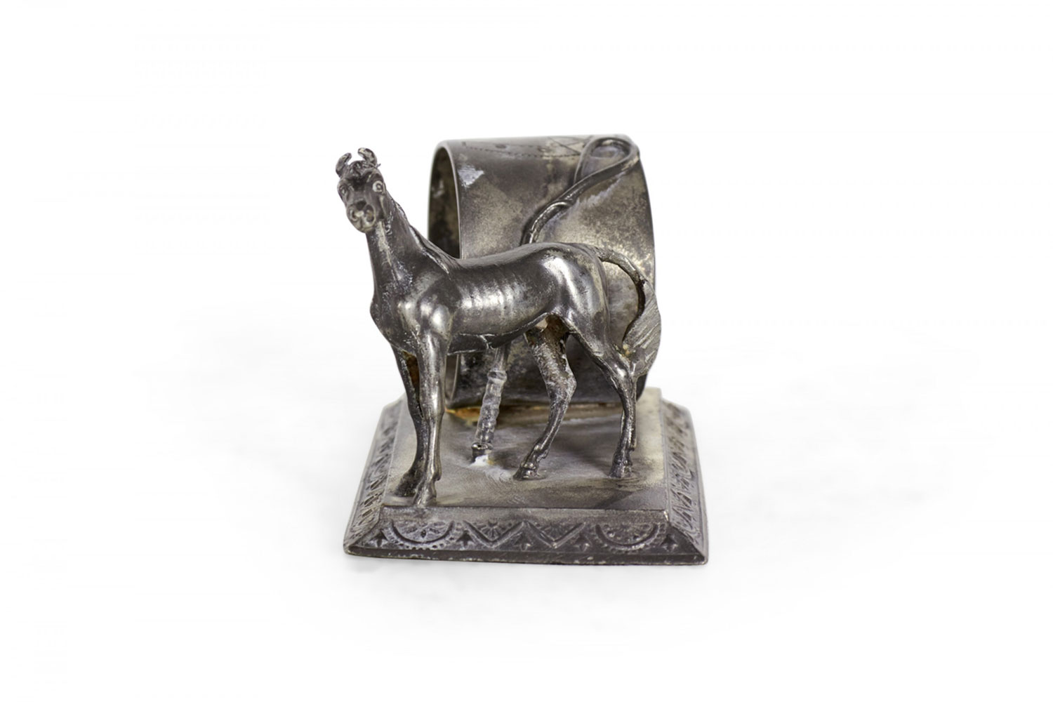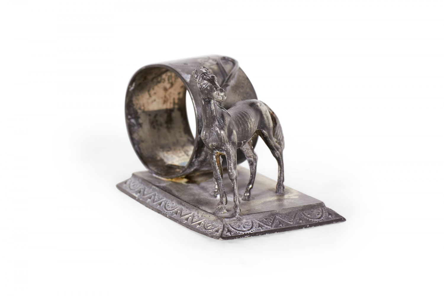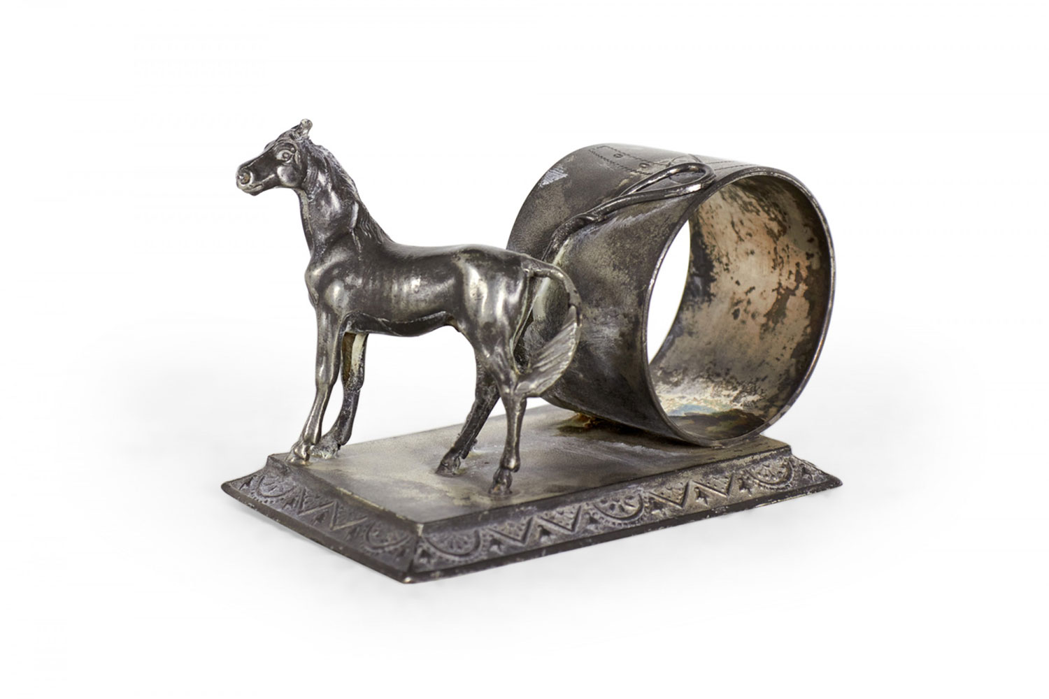 English Victorian silver plate napkin ring with horse and whip.