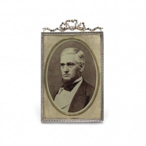 English Victorian silver-plate easel picture frame with oval inset and bow knot top.