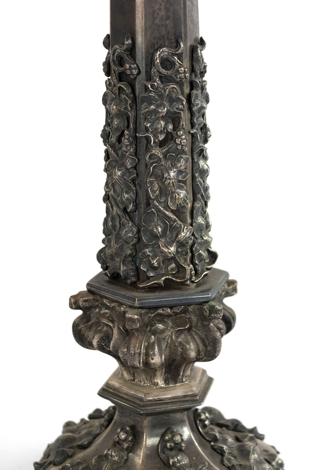 English Victorian silver-plate 6 sided column form altar stick mounted as a table lamp with applied oak leaves and floral trim.