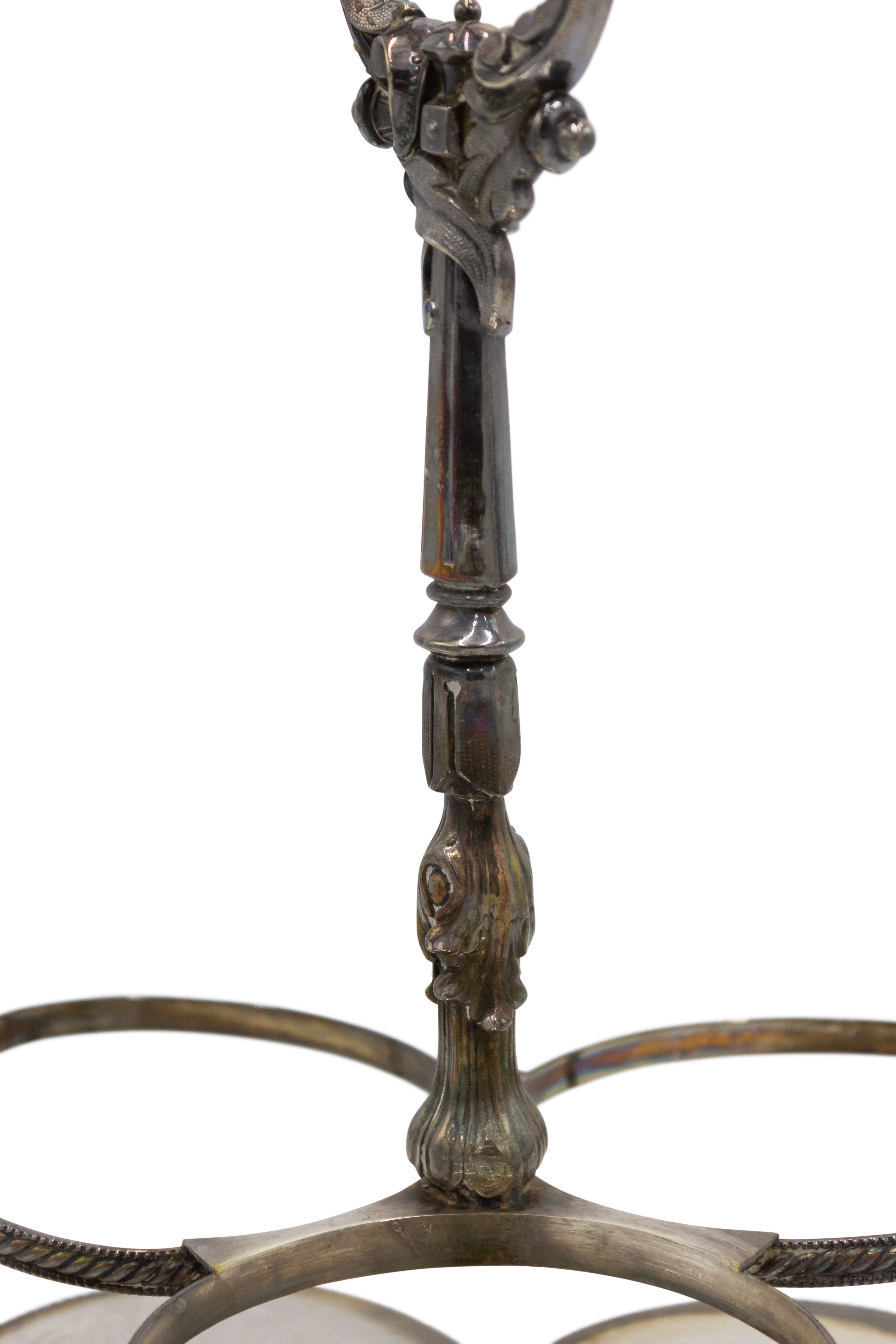 English Victorian silver plate tantalus set with 3 cut crystal decanters.