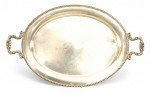English Victorian oval silver plate tray with fluted edge and etched surface with handles.