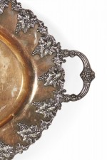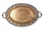 English Victorian oval silver plate etched and fluted tray with initials and grape design edge and handles.