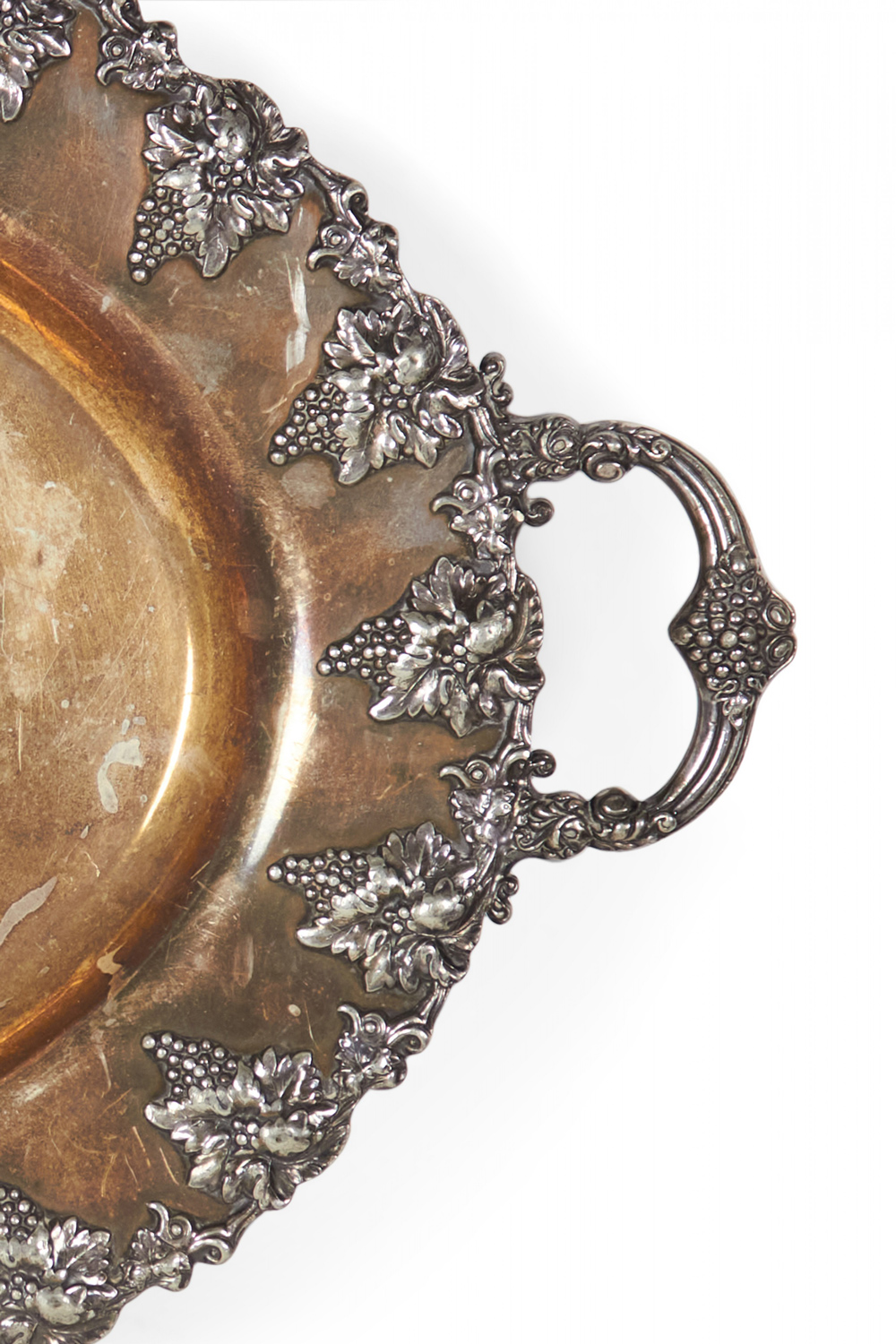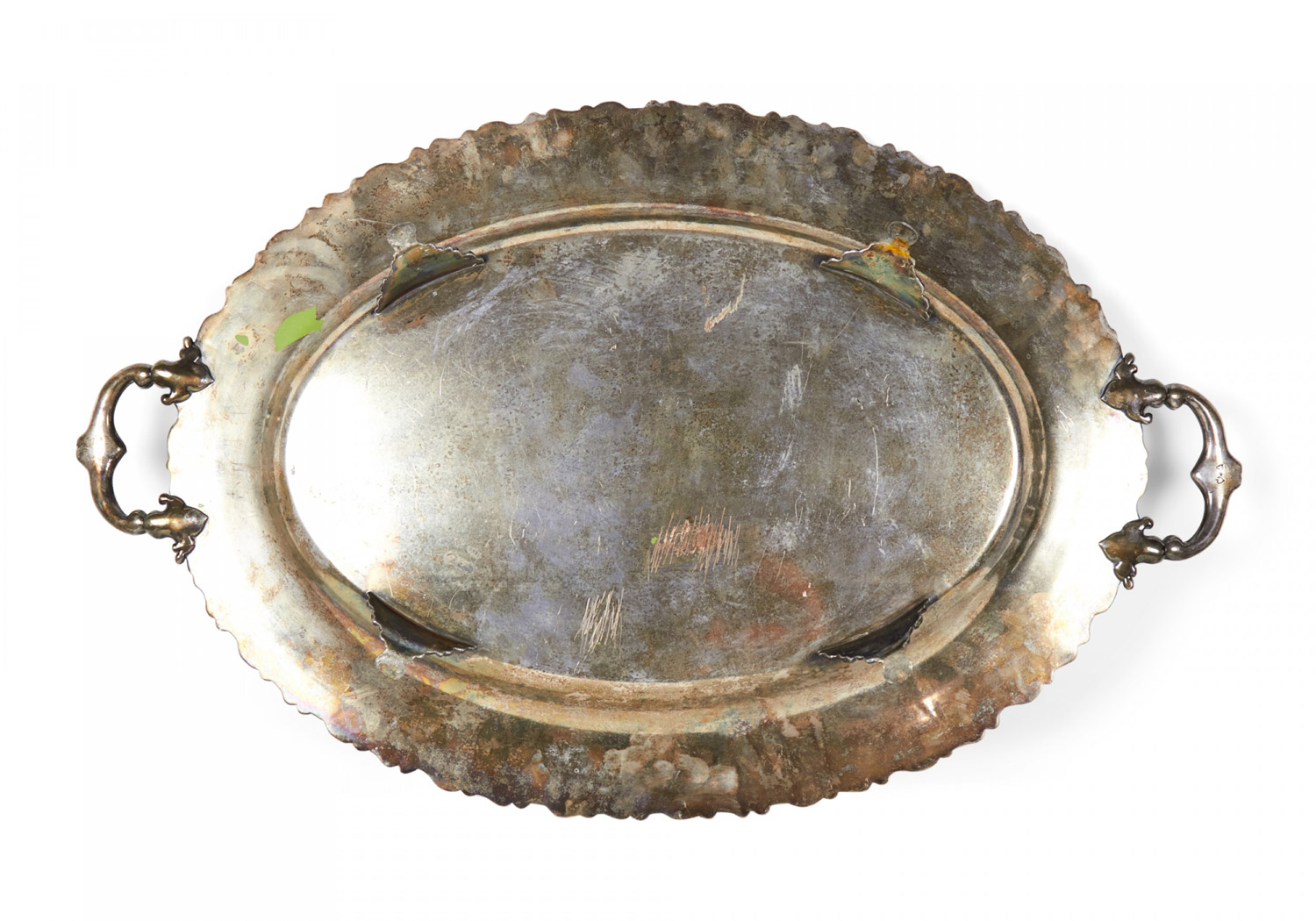 English Victorian oval silver plate etched and fluted tray with initials and grape design edge and handles..