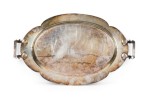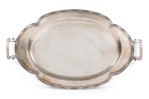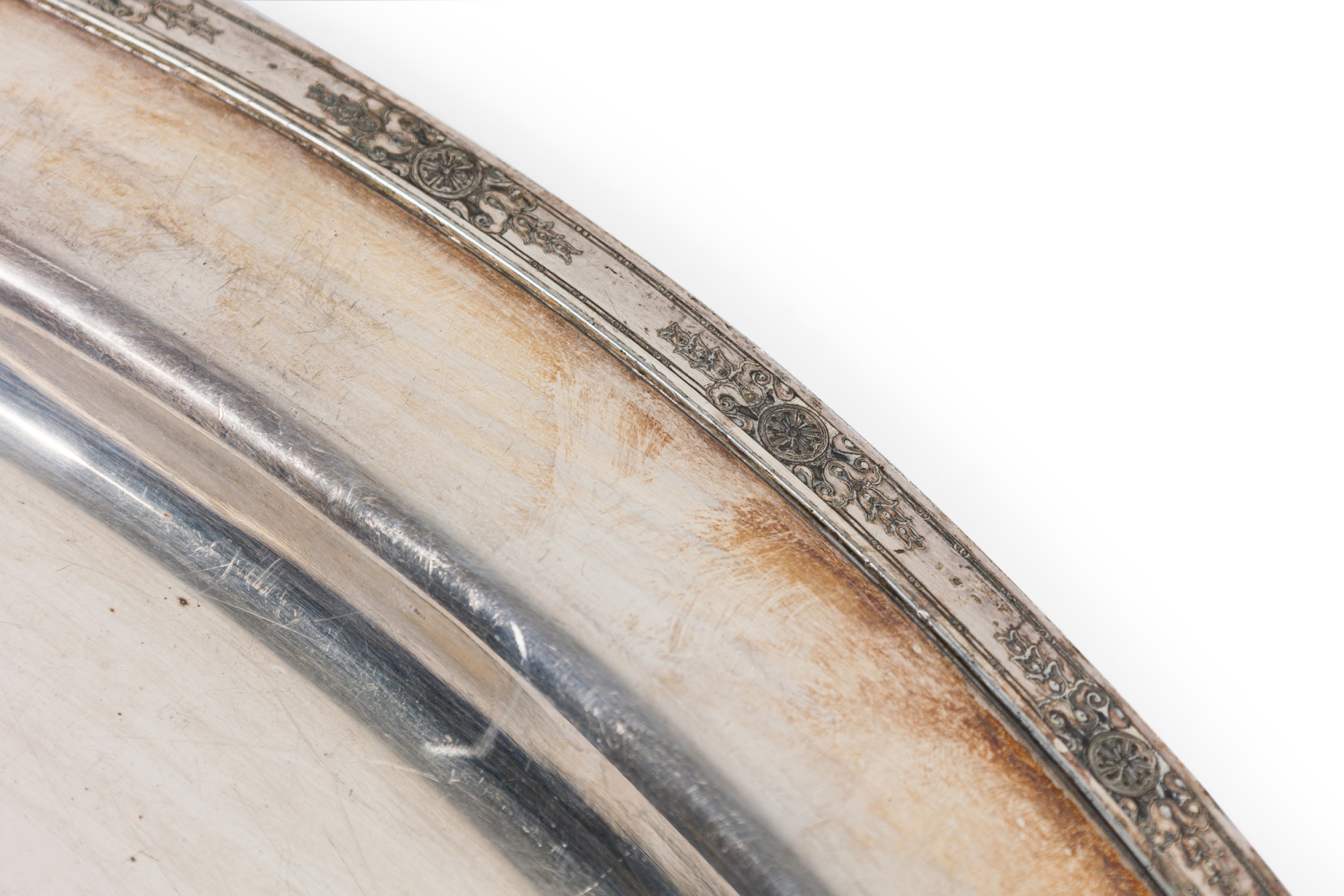 English Victorian oval silver plate tray with handles and scalloped edge and etched border.