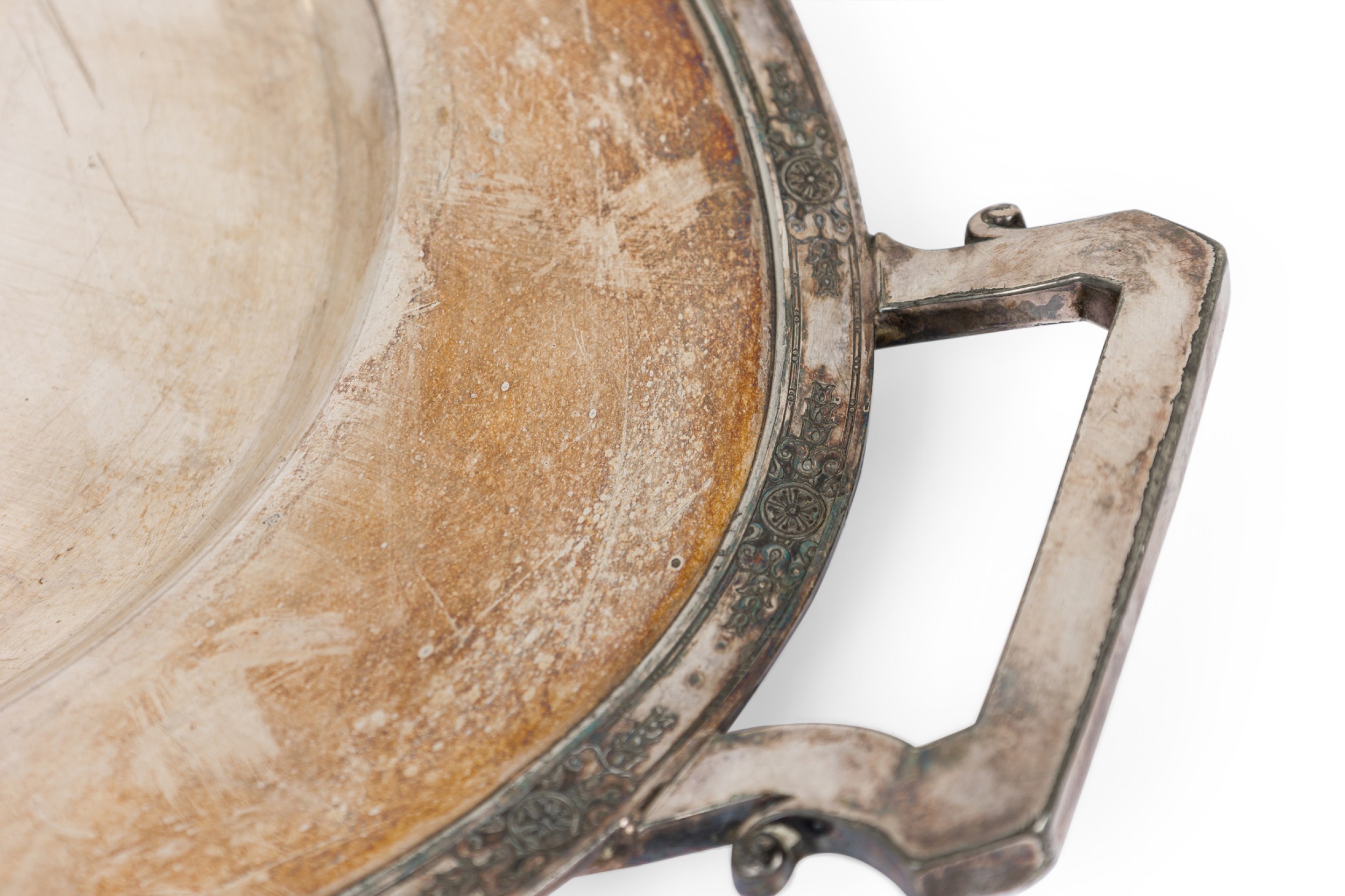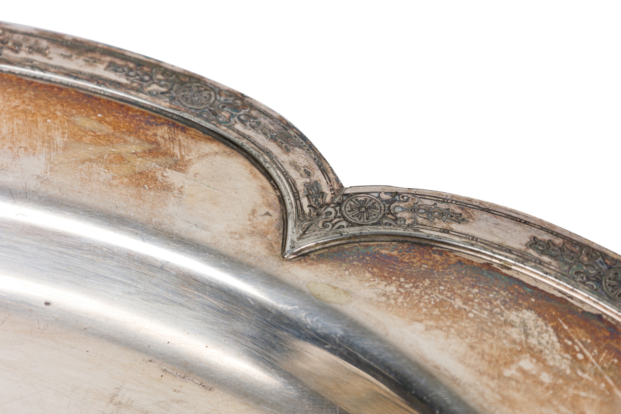 English Victorian oval silver plate tray with handles and scalloped edge and etched border..