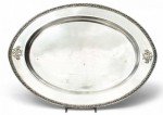 English Victorian oval silver plate tray with scroll edge and crest sides.