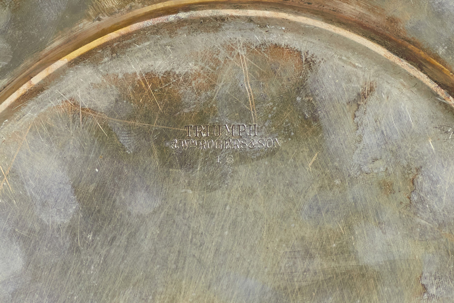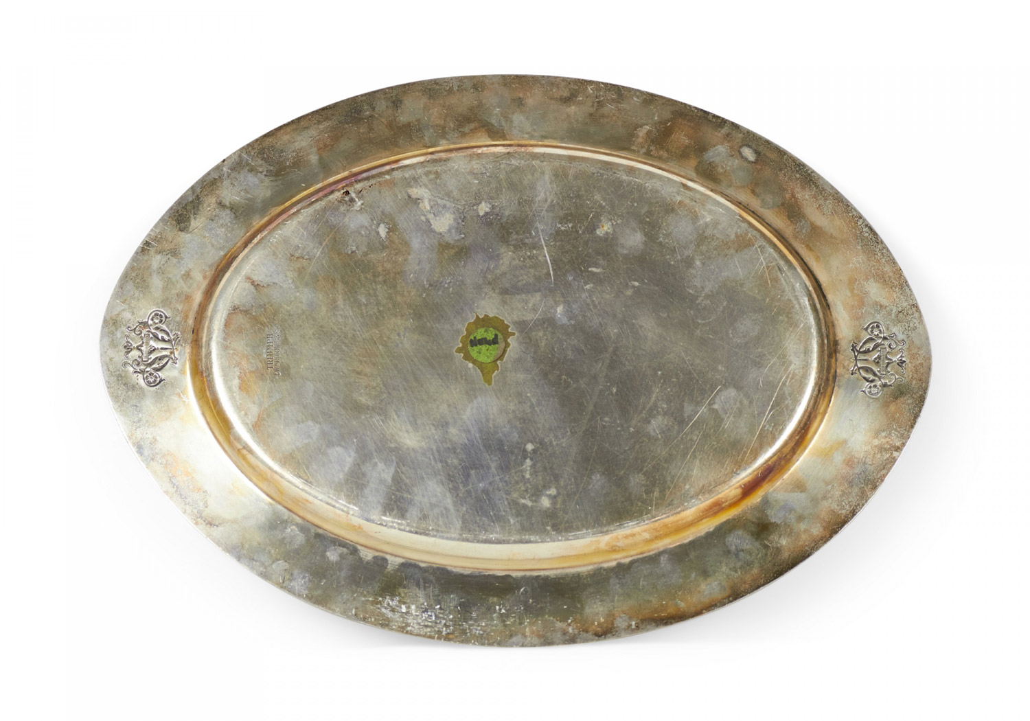 English Victorian oval silver plate tray with scroll edge and crest sides