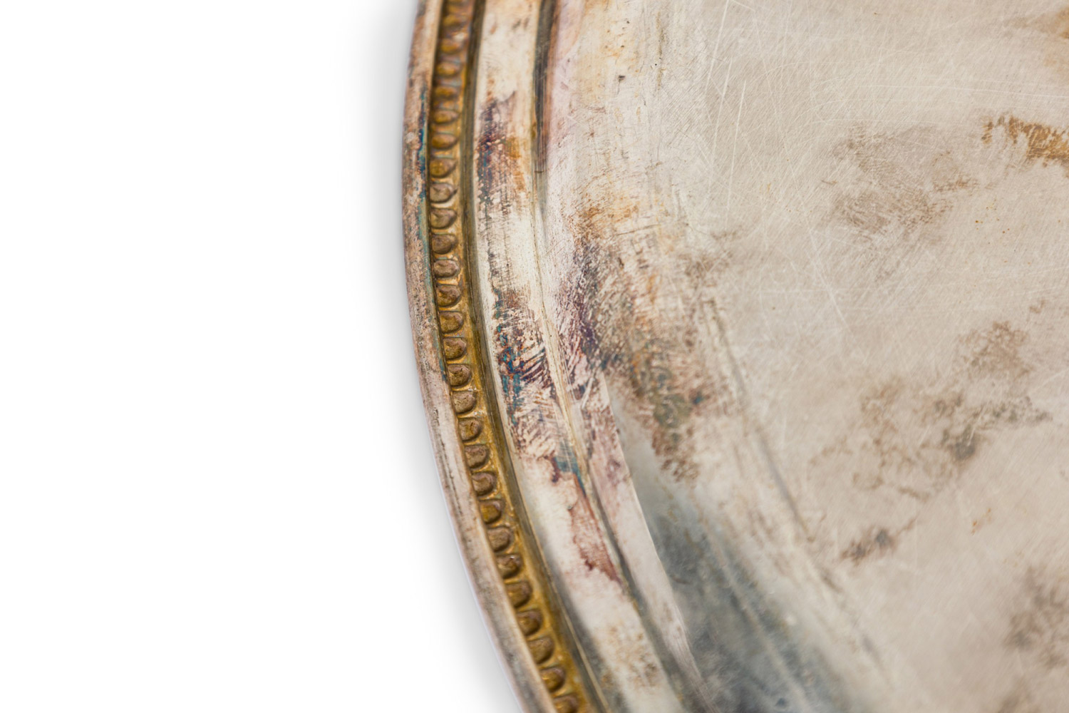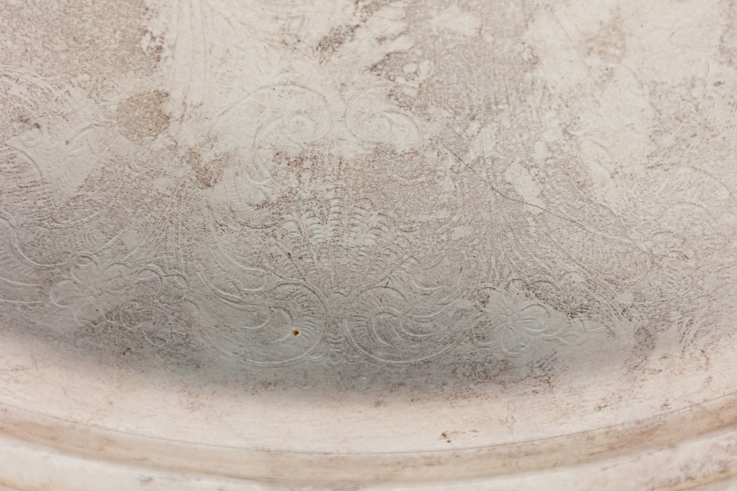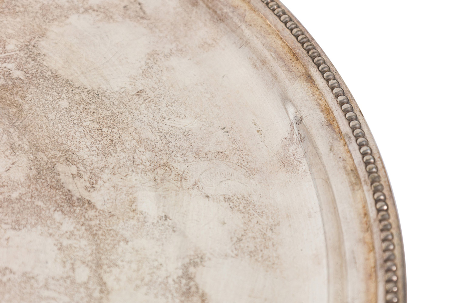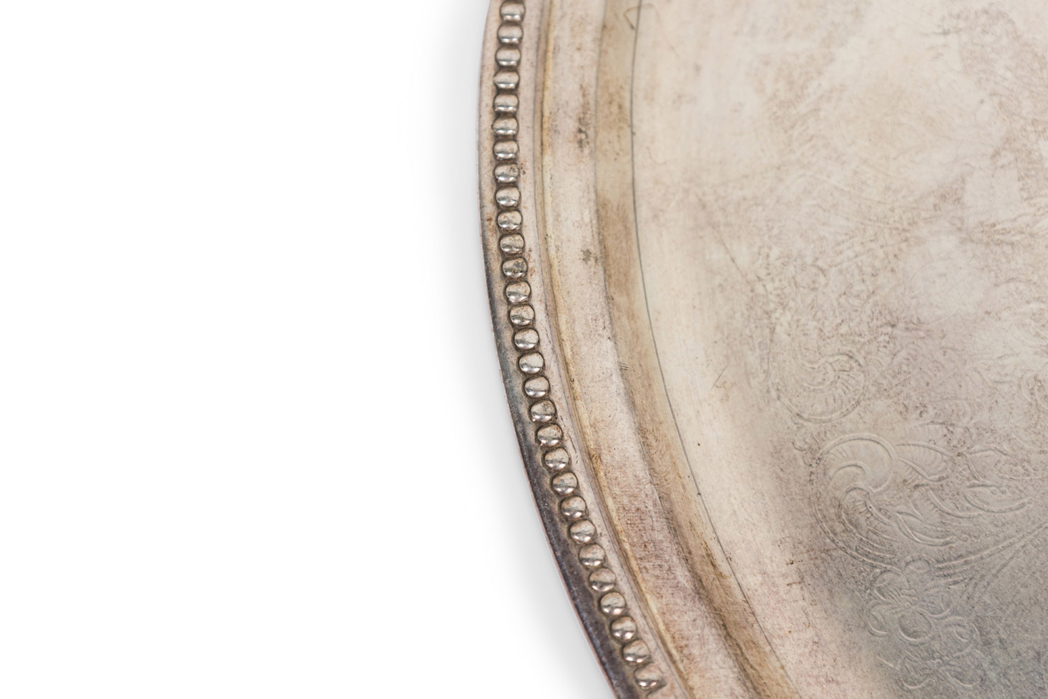 English Victorian round silver-plate tray with a beaded edge and a floral and scroll etched surface