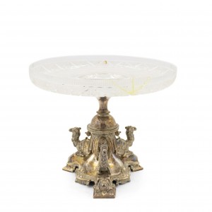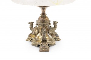 PAIR of English Victorian (Dated 1865) silver plated centerpieces with camels kneeling on the tripartite base beneath a cut-glass dish (PRICED AS PAIR)