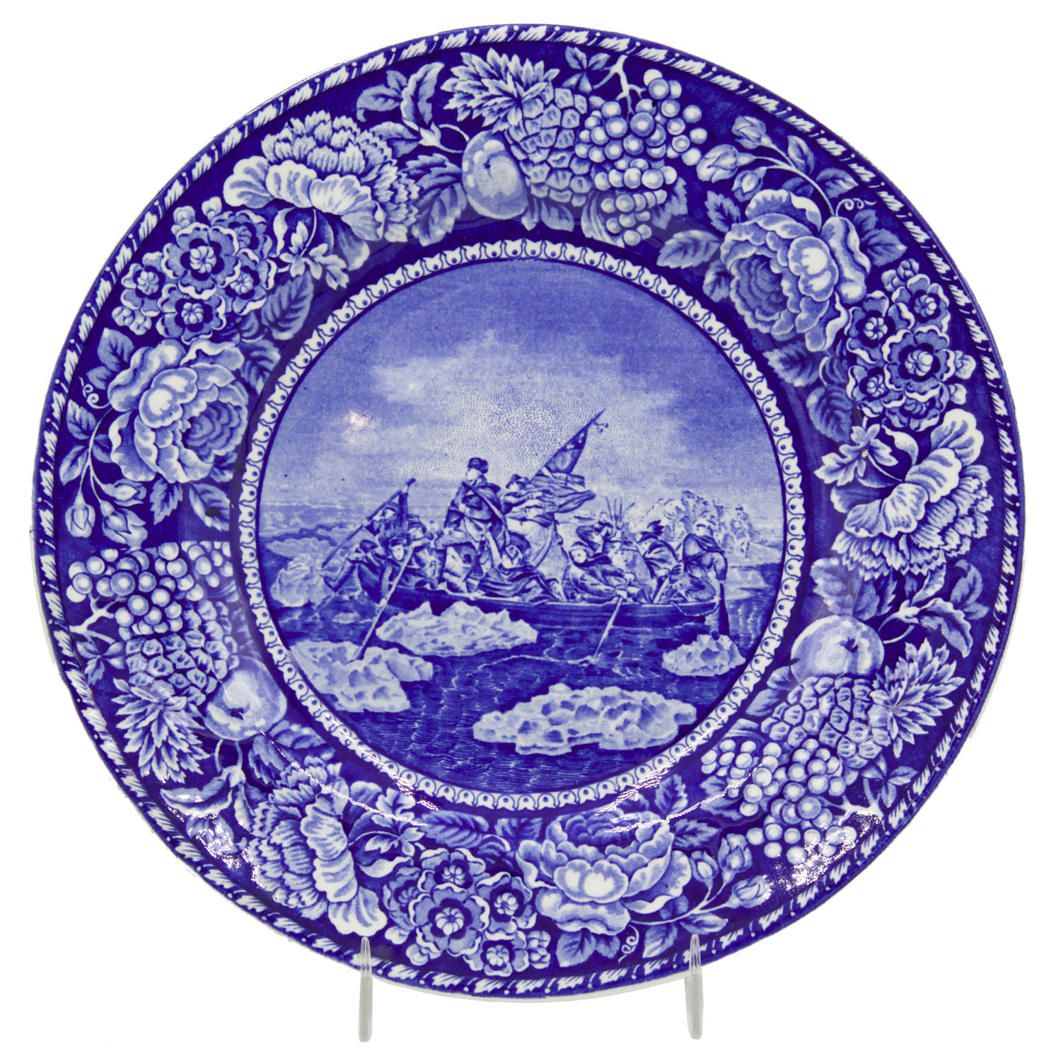 Set of 15 English Victorian (20th Century) blue and white porcelain dinner plates with American historical scenes (Staffordshire). This is a married group of 15 same size and color but different images. Old South Church Boston Mass x 2 The Elm at Cambridge x 2 Battle of Bunker Hill x 3 Faveuil Hall Boston x 2 Washington Crossing the Delaware x 3 Home of Washington Mt Vernon x 3