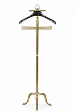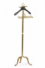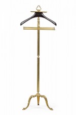 English Victorian-Style (mid 20th Century) brass valet stand with an embedded wood hanger, brass column with ribbed detail supporting coat, hat, and tie hangers anchored to a circular base with 3 scroll legs and hoofed feet.
