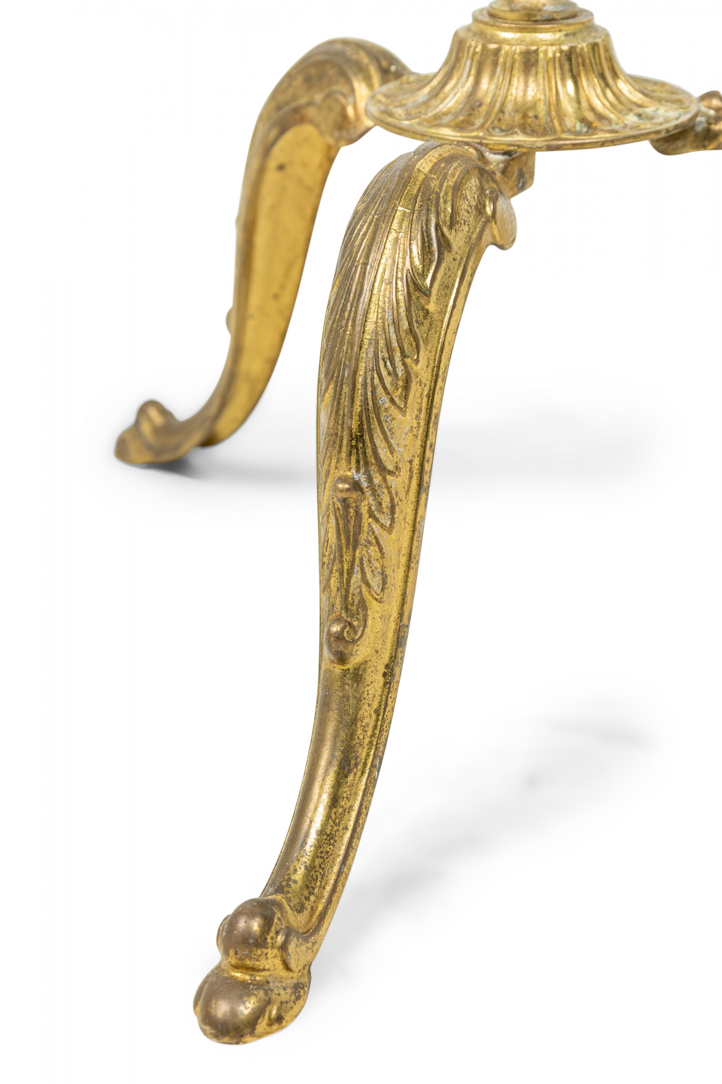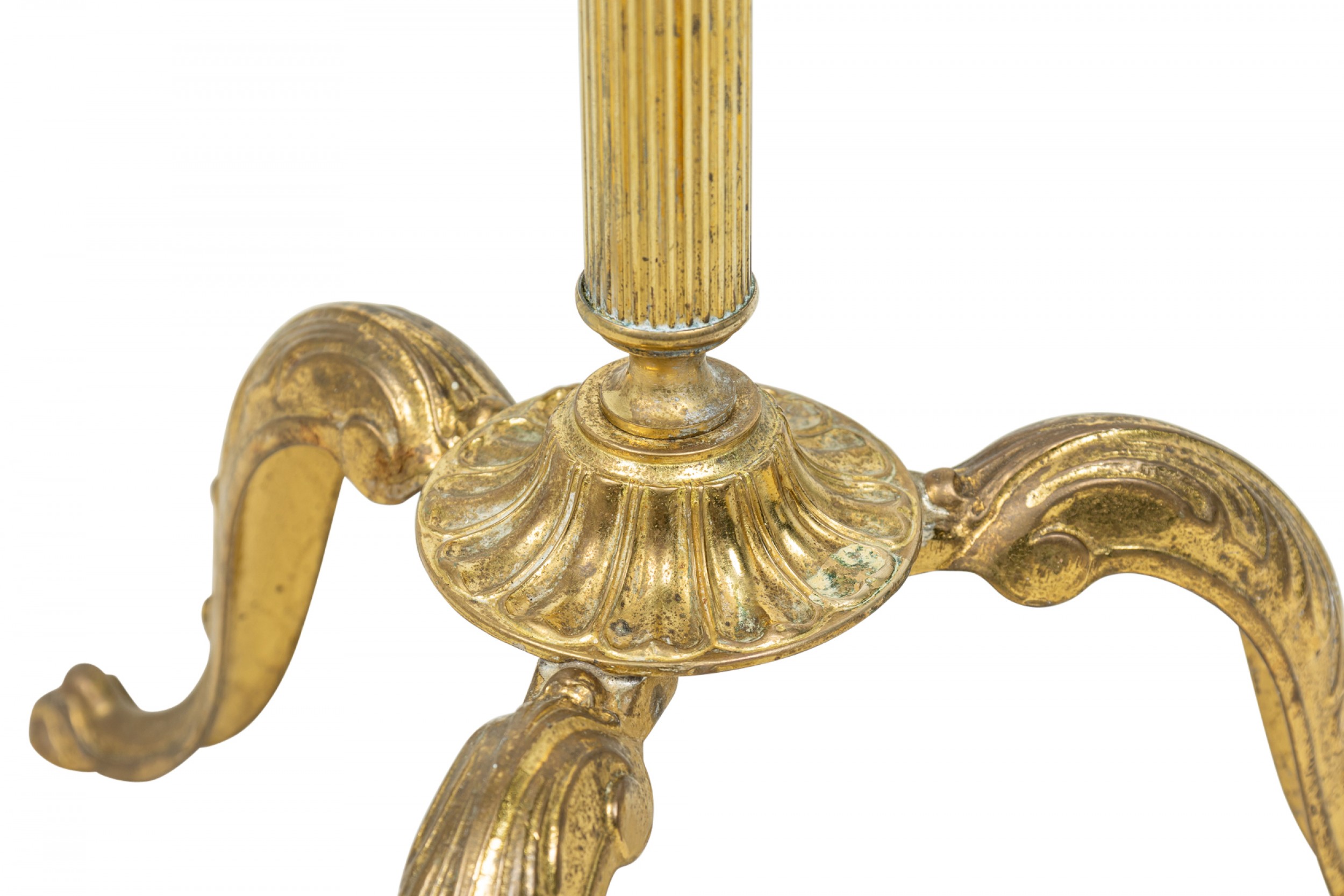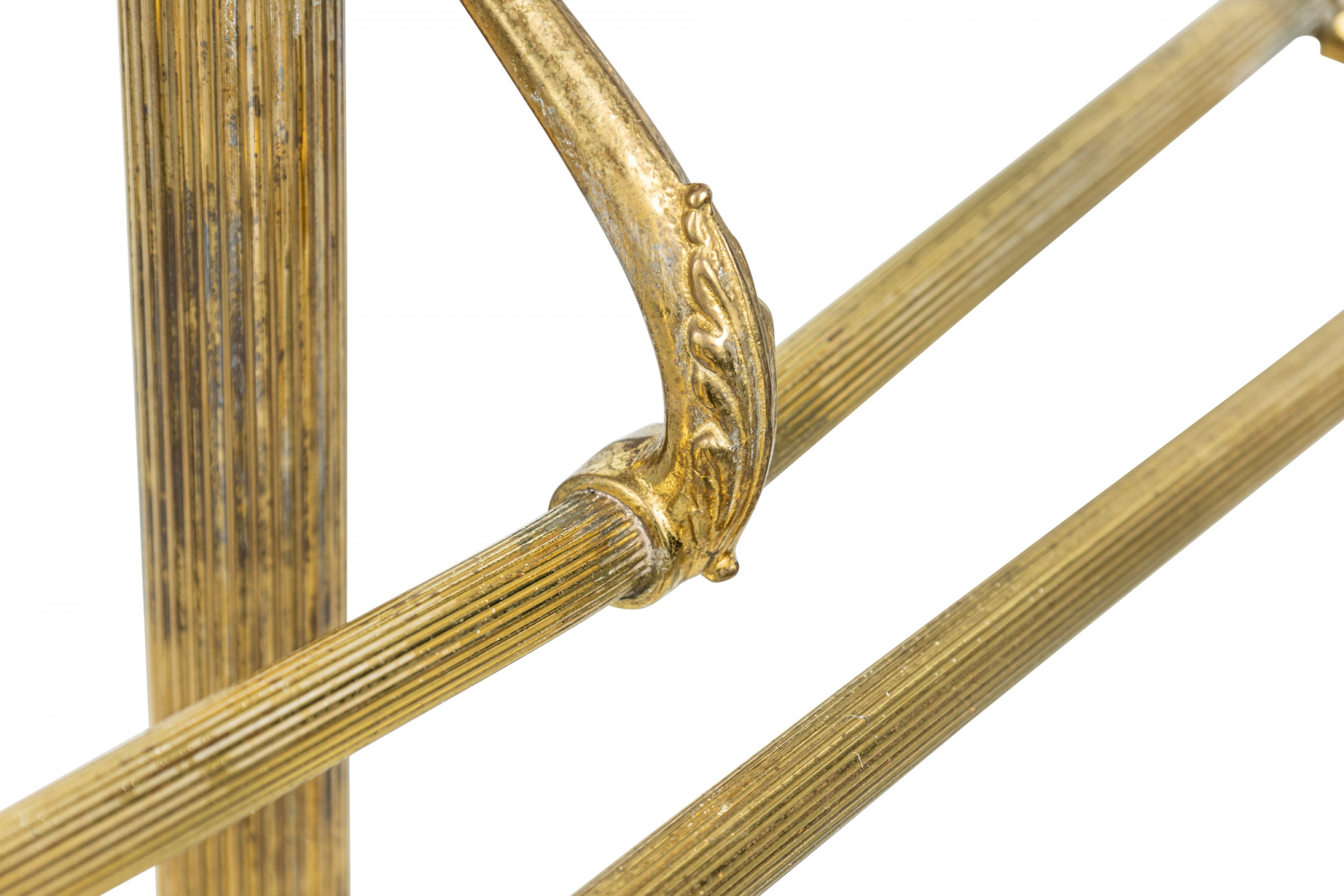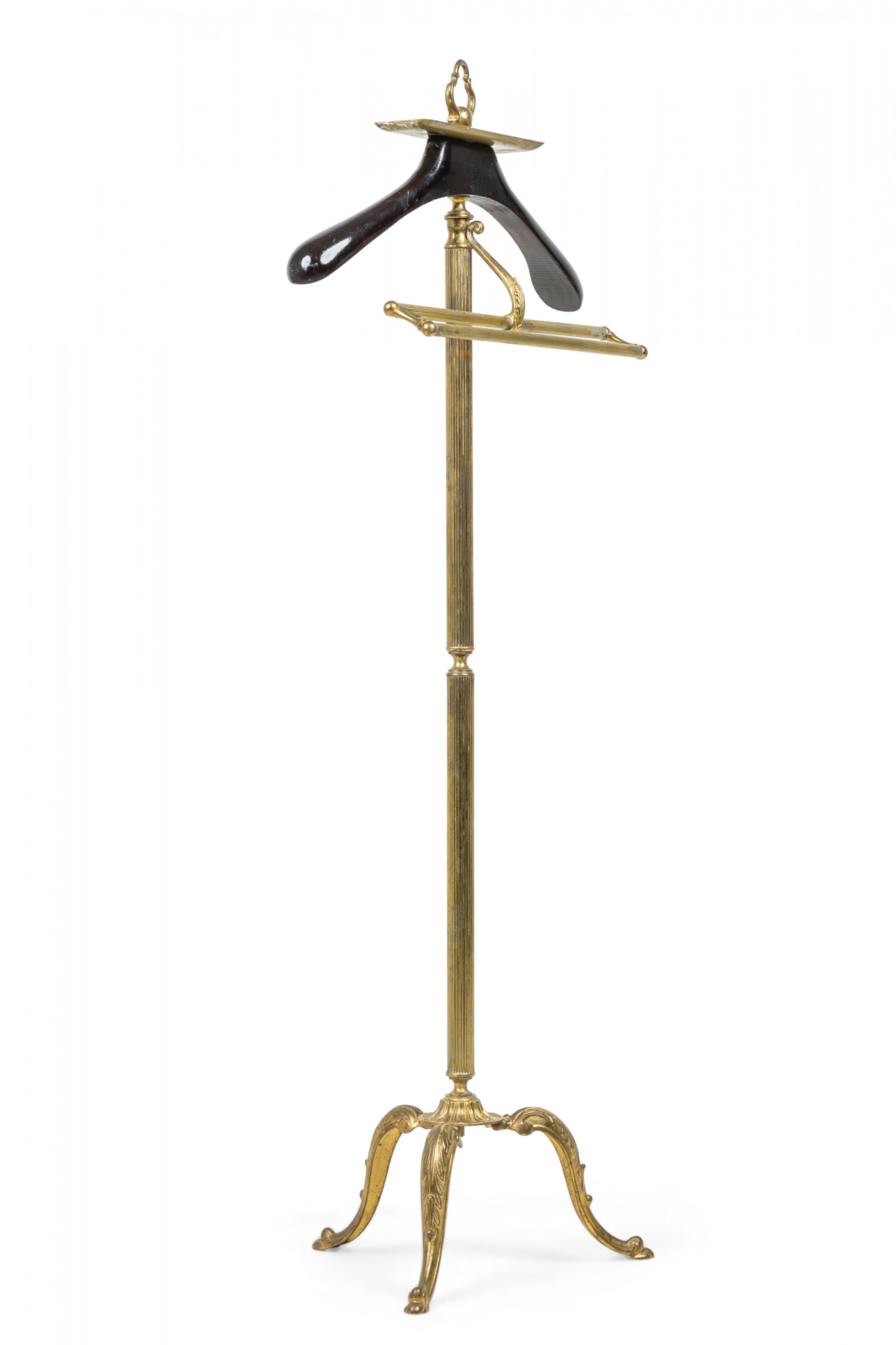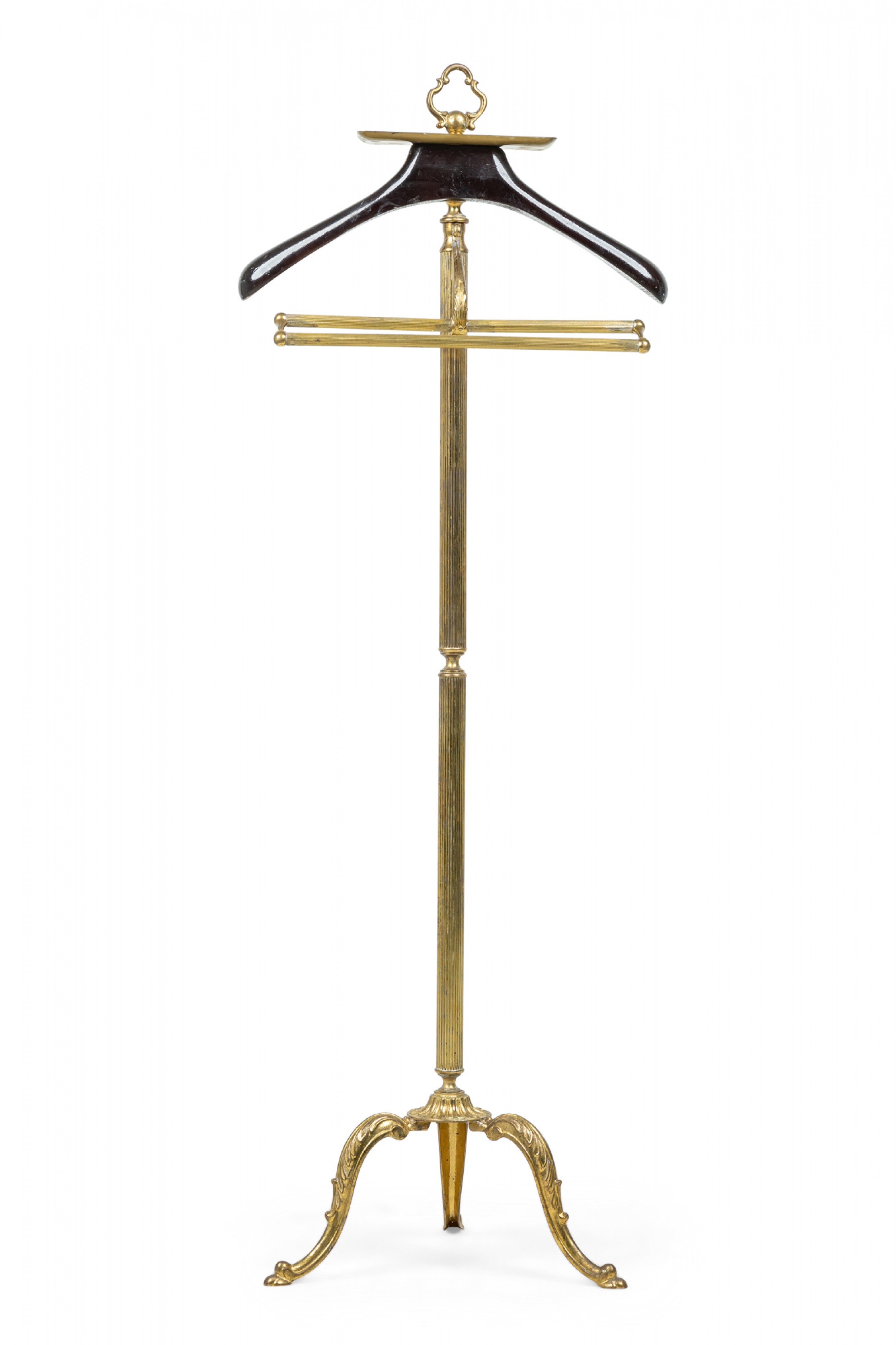 English Victorian-Style (mid 20th Century) brass valet stand with an embedded wood hanger, brass column with ribbed detail supporting coat, hat, and tie hangers anchored to a circular base with 3 scroll legs and hoofed feet..