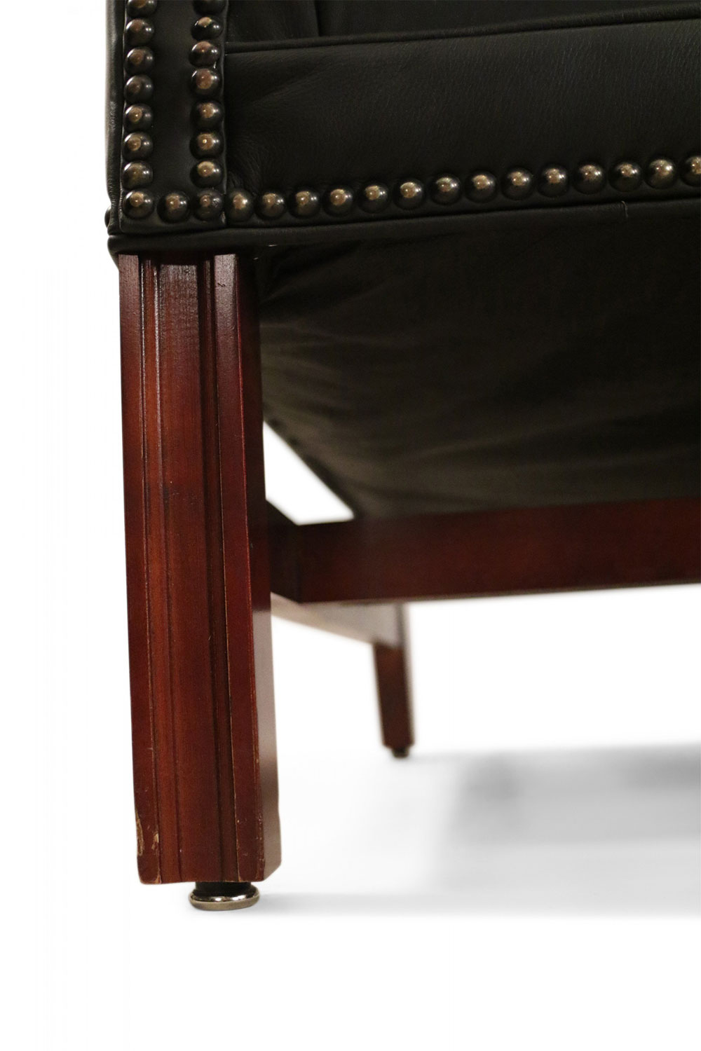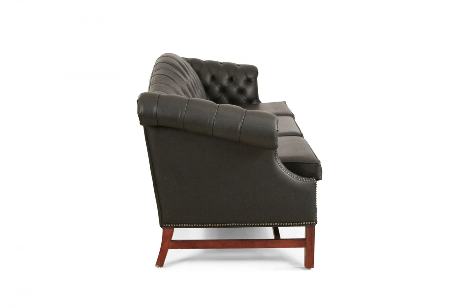 English Victorian-style (20th Century) three-seat camel back design sofa with black button tufted faux-leather upholstery and brass nail head detail with a wooden stretcher and legs, and a single seat cushion..