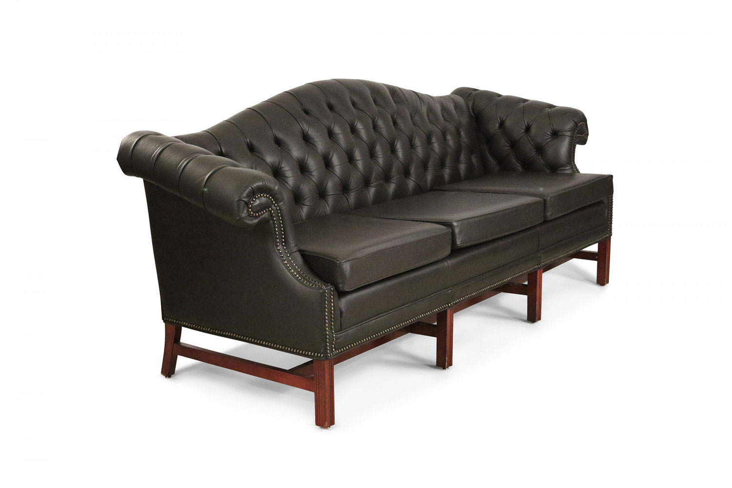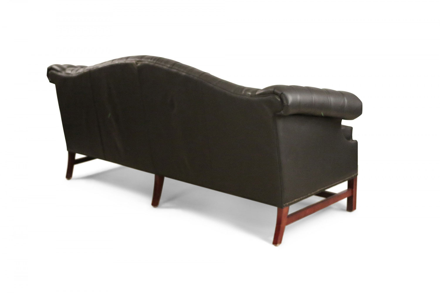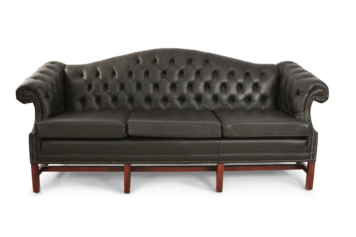 English Victorian Style Camel Back Black Tufted Leather Sofa