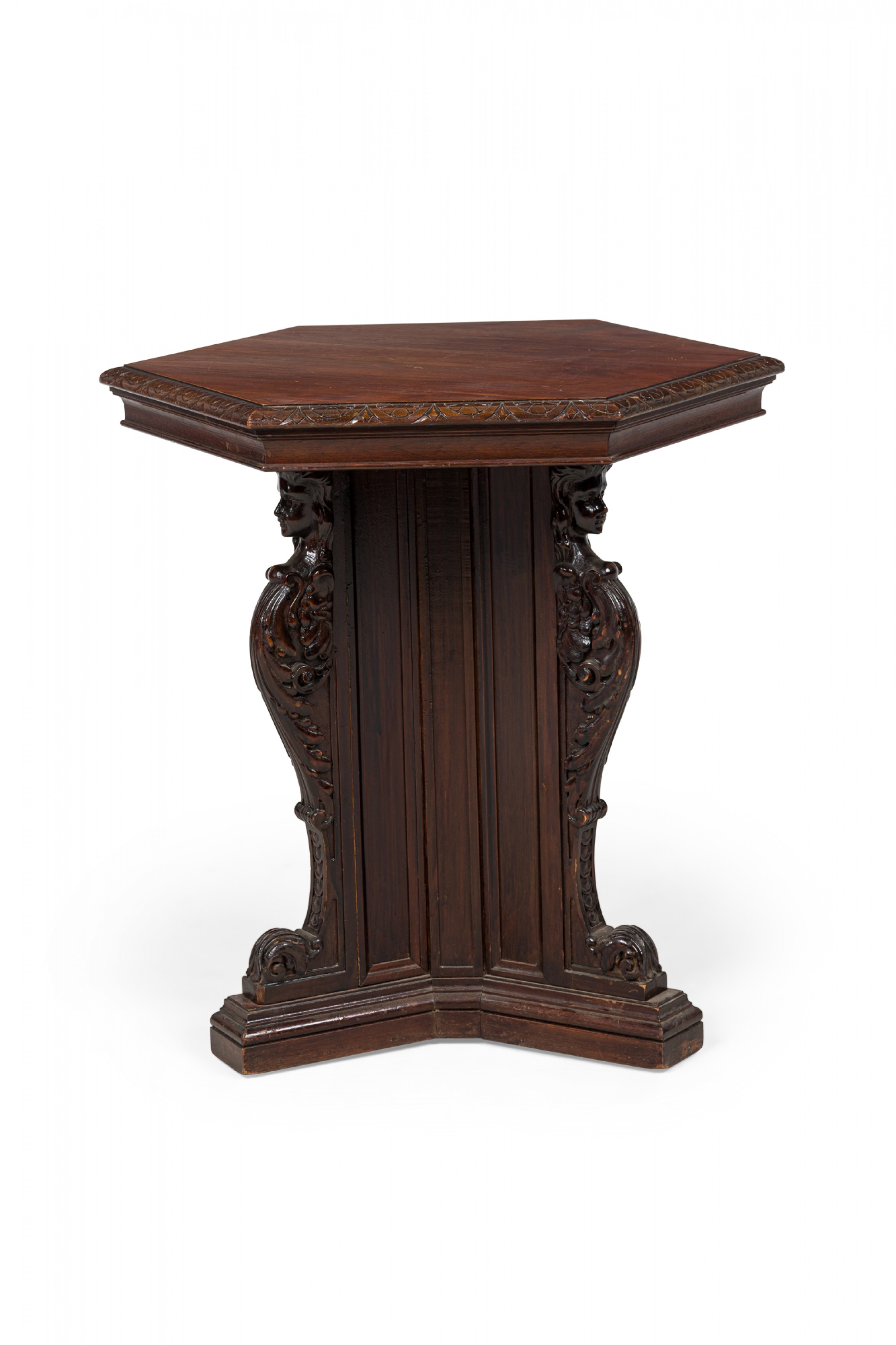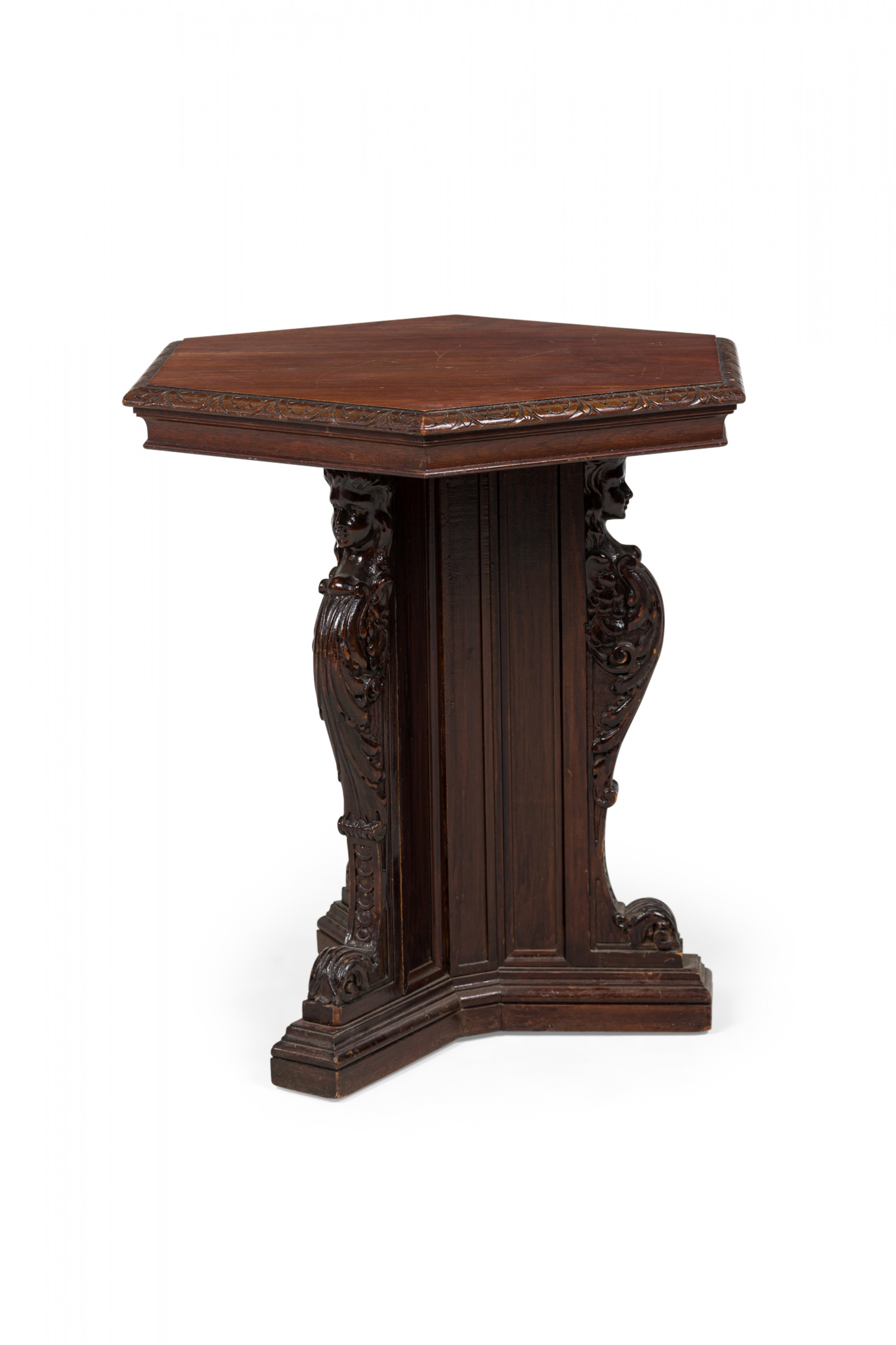English Renaissance-style hexagonal top occasional / end table with carved edges, resting on a 3 leg pedestal base with decorative scroll carving.
