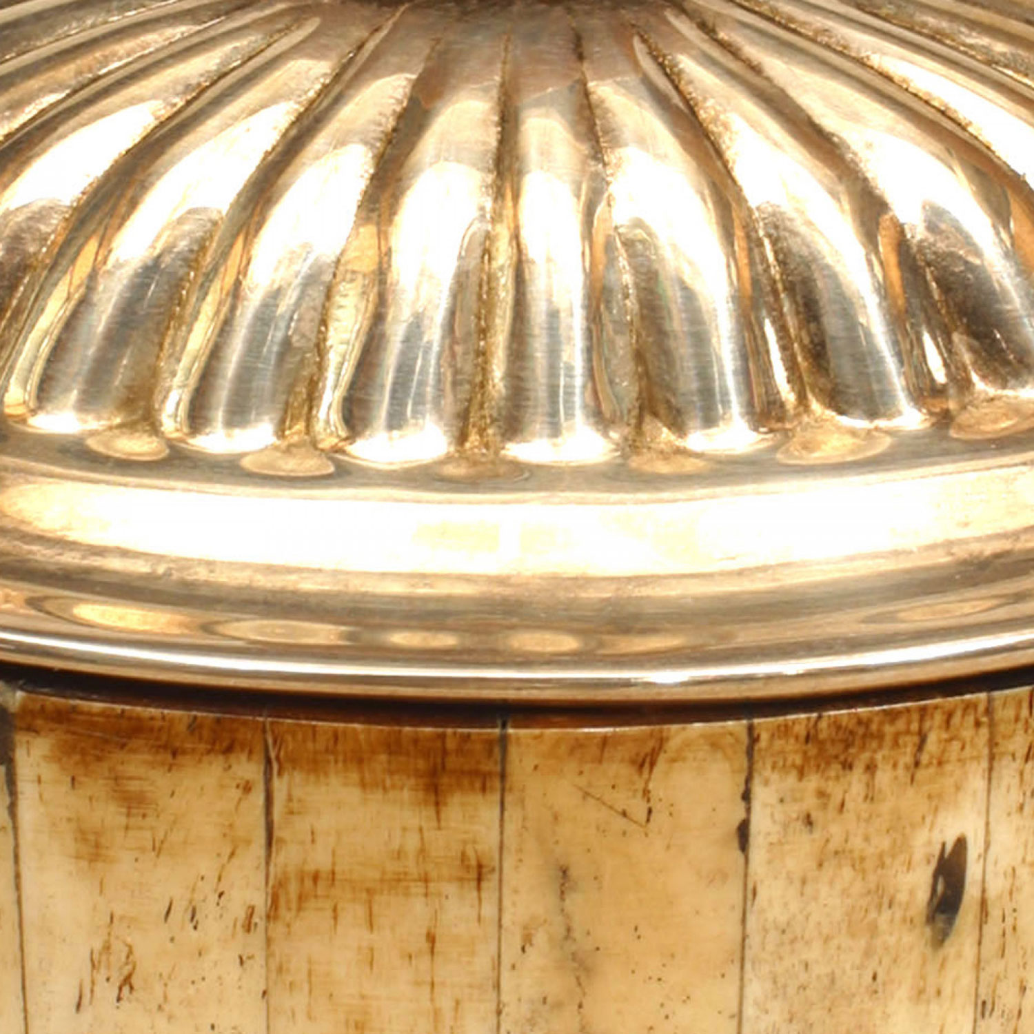 English Victorian-style (20th Century) oval veneer bone box with silver cover with fluted design and finial top. (label: Royal House-Collection Sheffield).