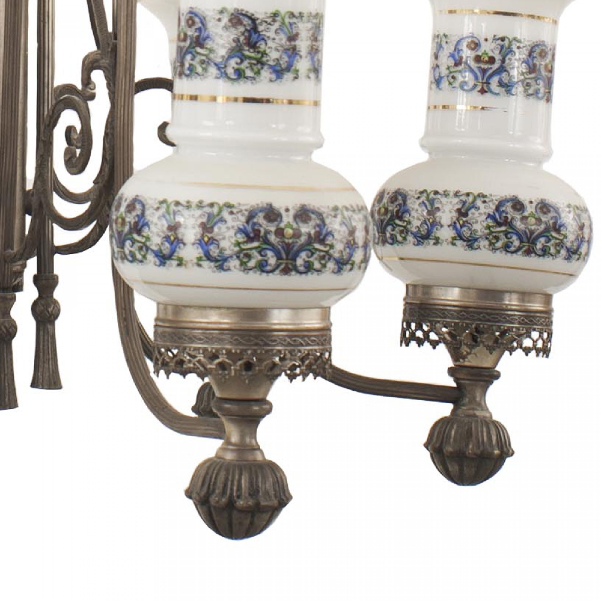 English Victorian style patinated pewter 6-arm chandelier with white glass hurricane globes featuring a blue, green, and red floral pattern.