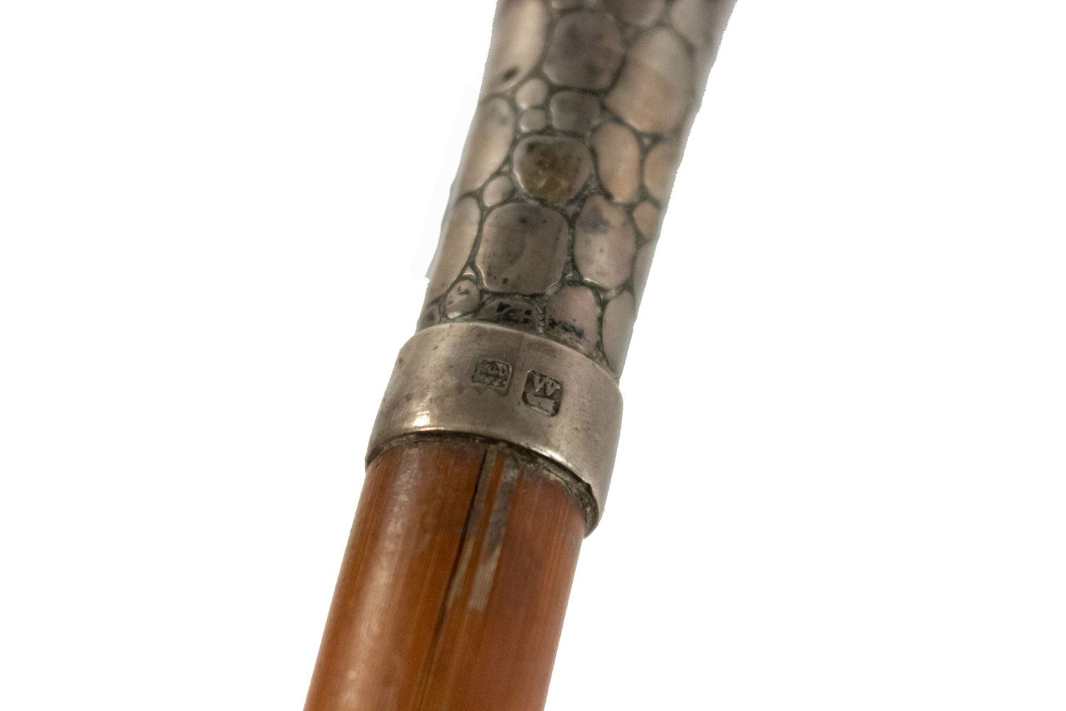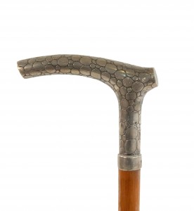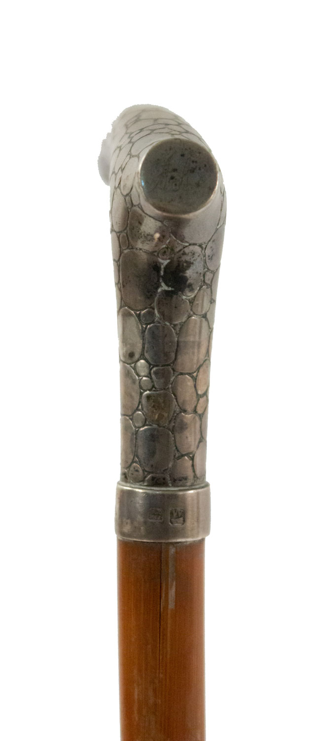 English Victorian-style simple wood cane with silver skin design handle with hallmarks at base.