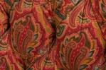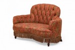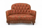 English Victorian-style loveseat with a rounded back, curved arms, and shaped seat, upholstered in a red, orange, yellow, and blue paisley fabric with tufted detail and pleated edge, resting on four turned wooden legs with a rope fringe skirt. (Matching ottoman: 063520B).