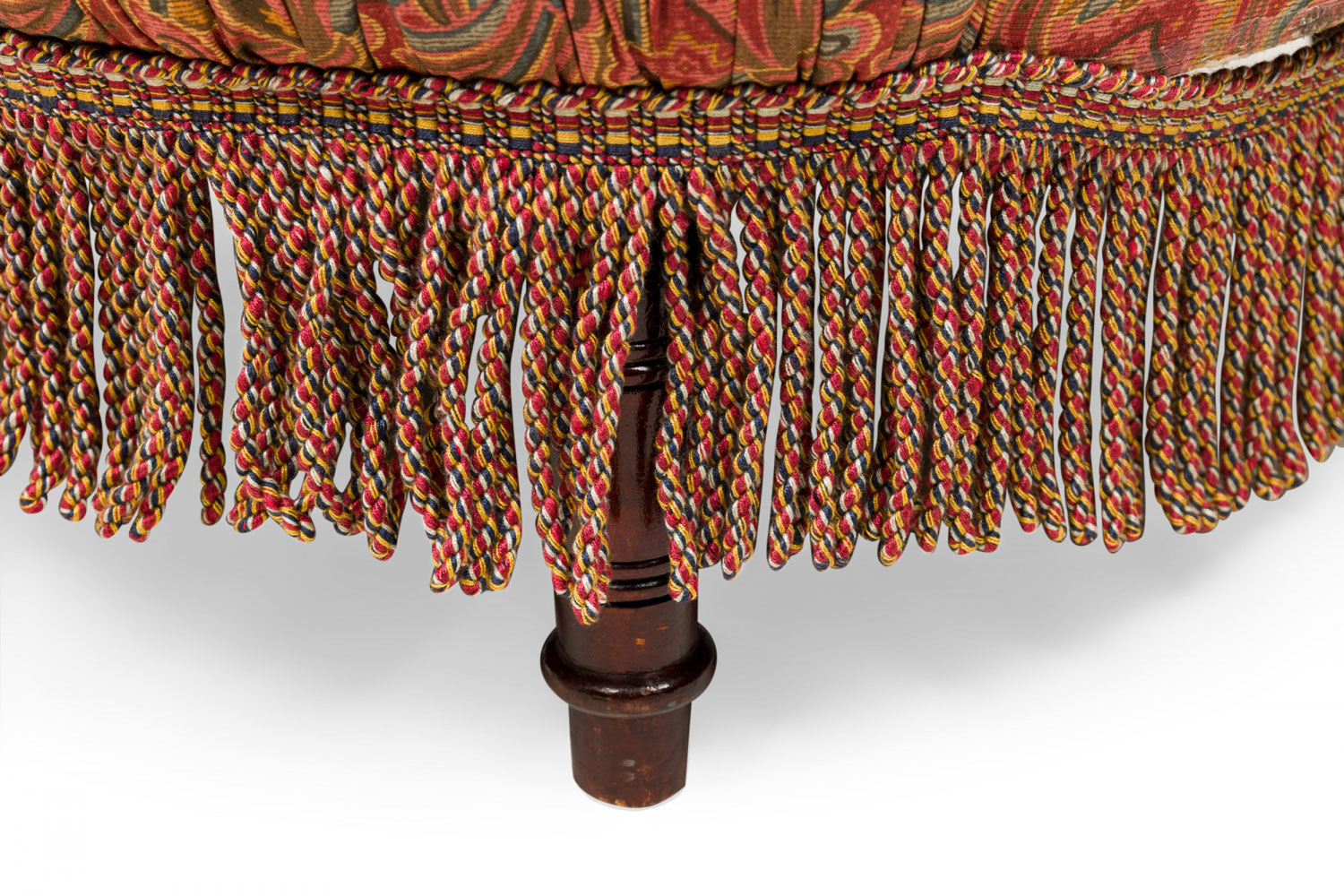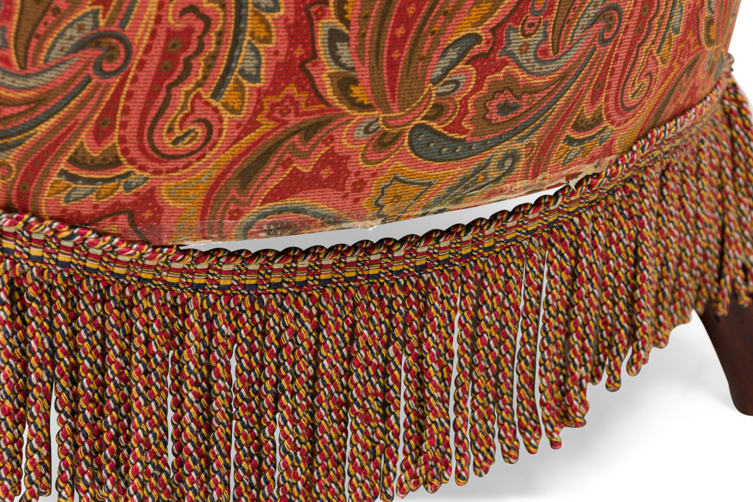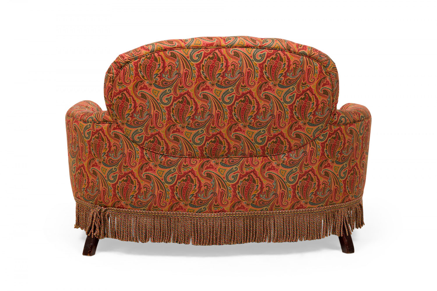 English Victorian-style loveseat with a rounded back, curved arms, and shaped seat, upholstered in a red, orange, yellow, and blue paisley fabric with tufted detail and pleated edge, resting on four turned wooden legs with a rope fringe skirt. (Matching ottoman: 063520B)