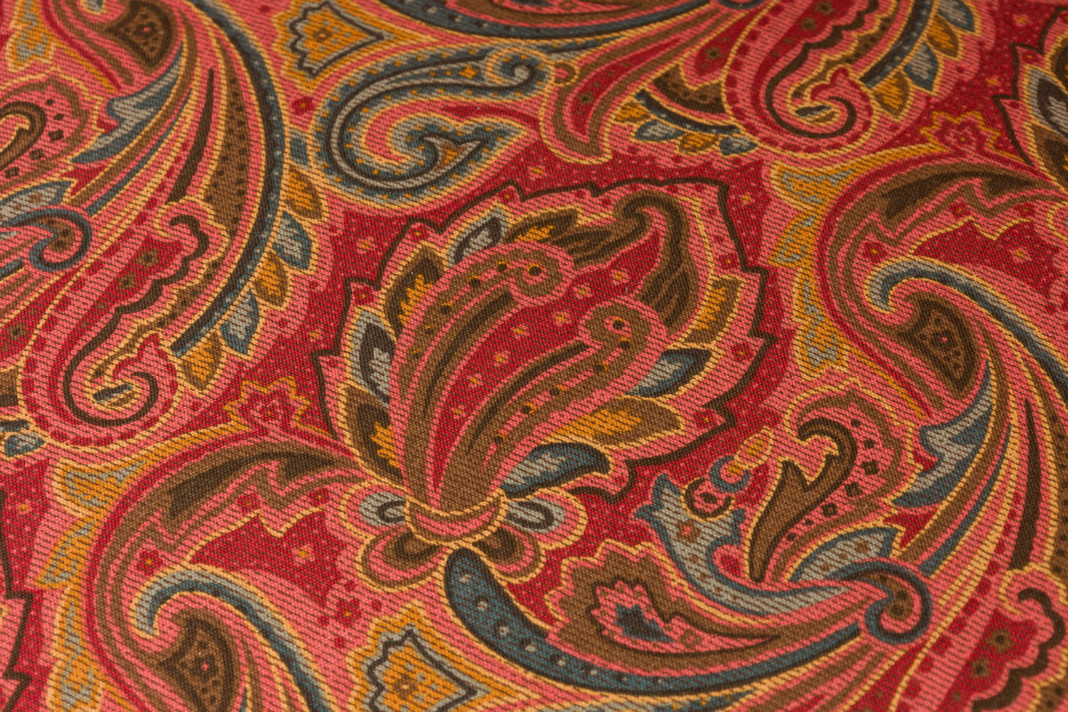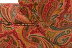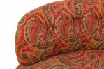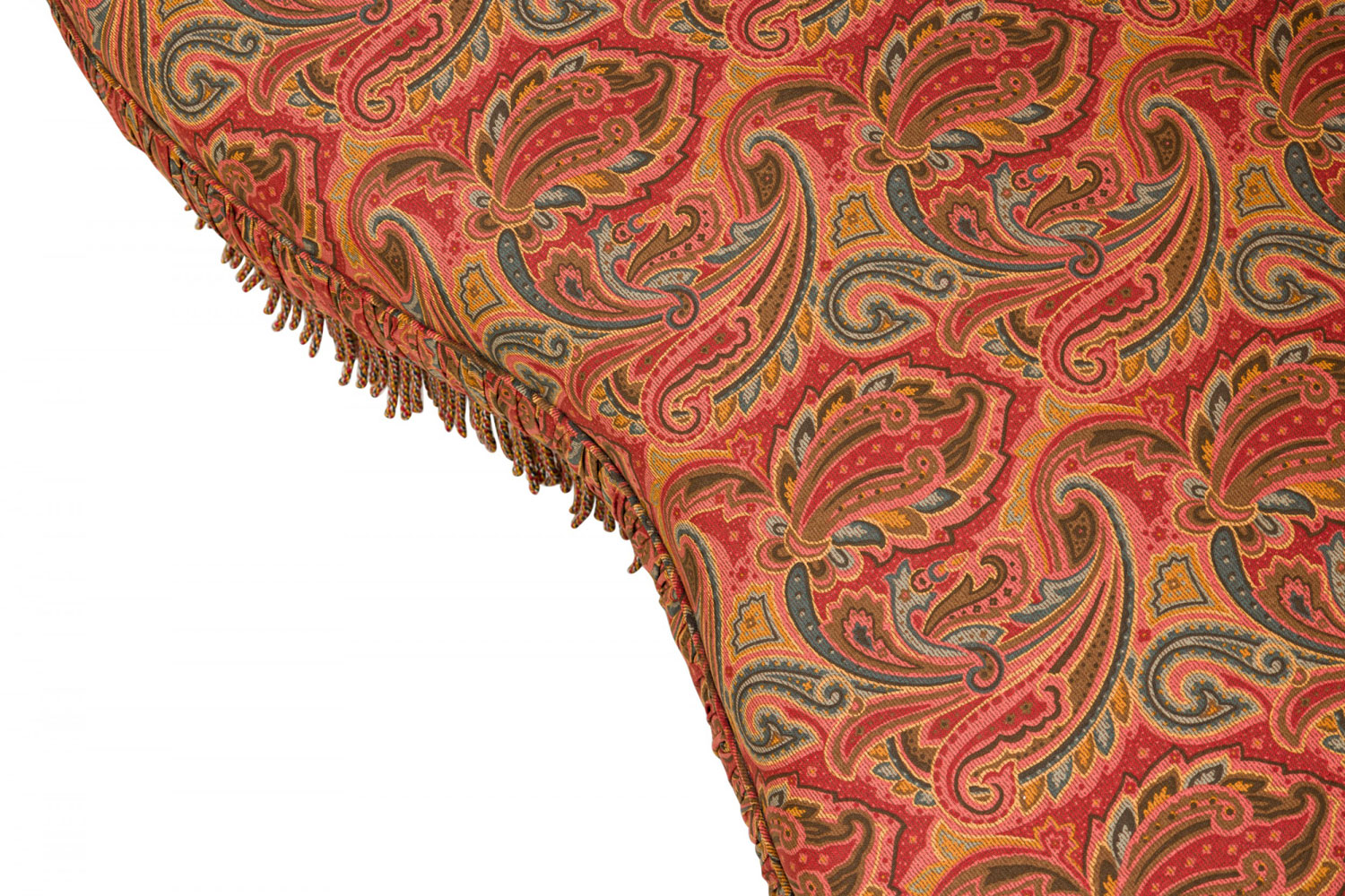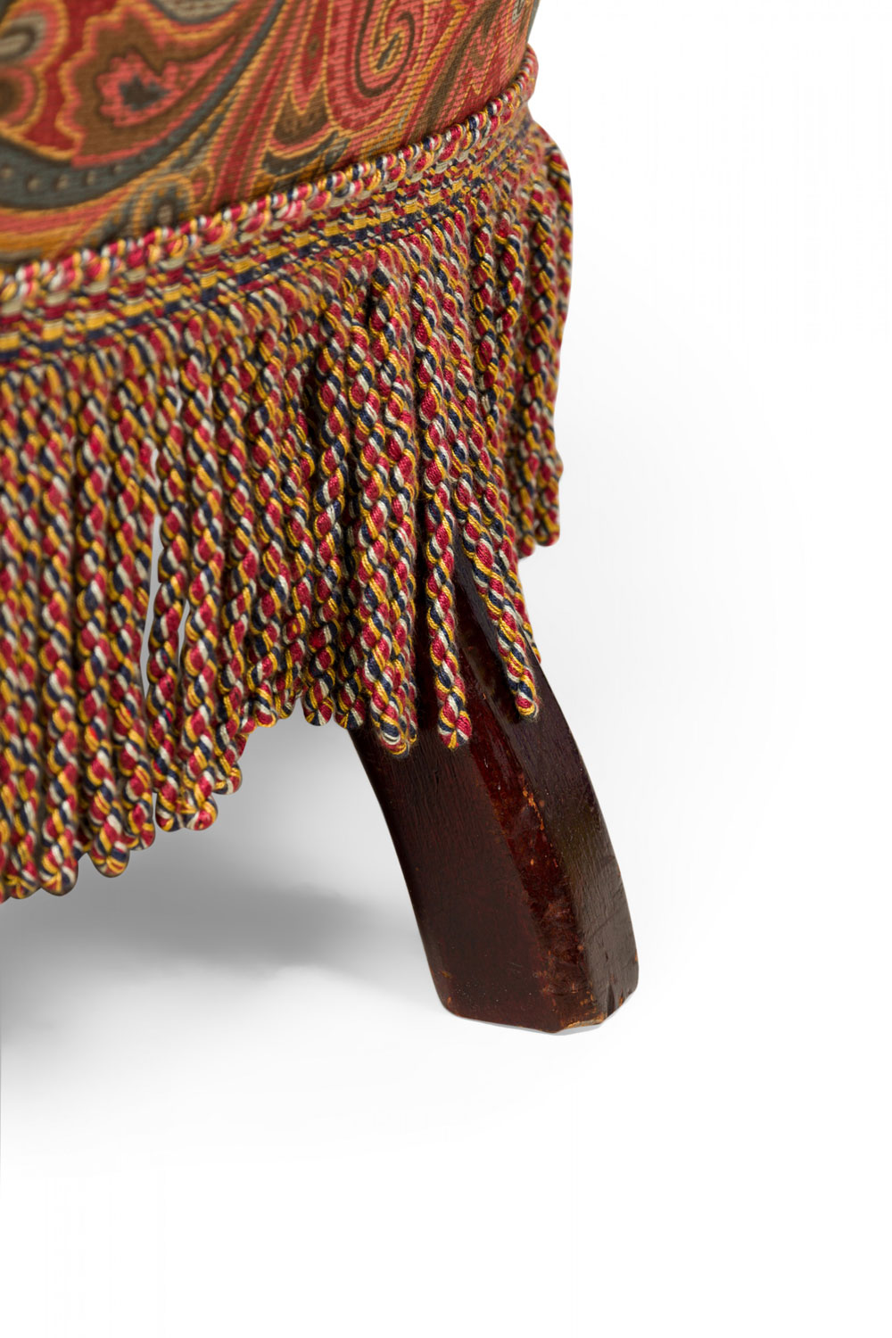 English Victorian-style loveseat with a rounded back, curved arms, and shaped seat, upholstered in a red, orange, yellow, and blue paisley fabric with tufted detail and pleated edge, resting on four turned wooden legs with a rope fringe skirt. (Matching ottoman: 063520B)