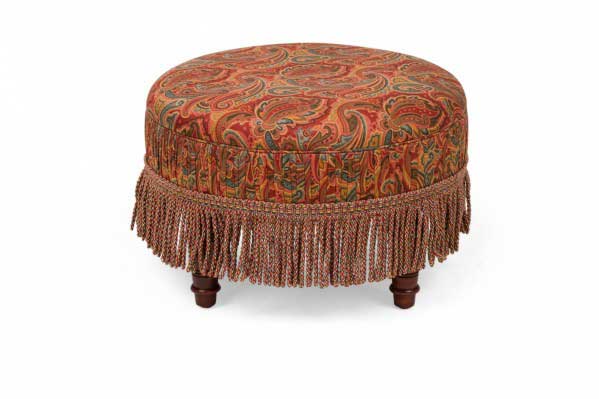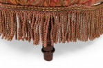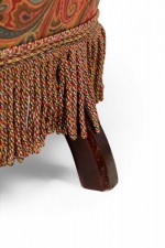 Style: English Materials & Techniques: Fabric, fringe, tufted, turned, upholstered, wood Category: Seating Good; Wear consistent with age and use