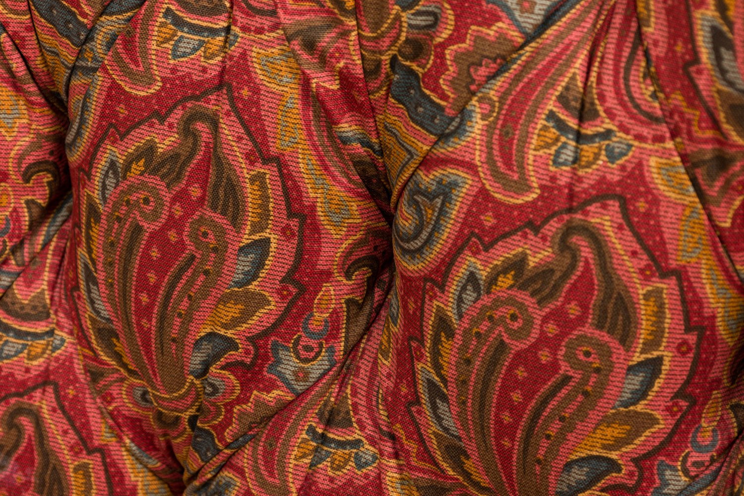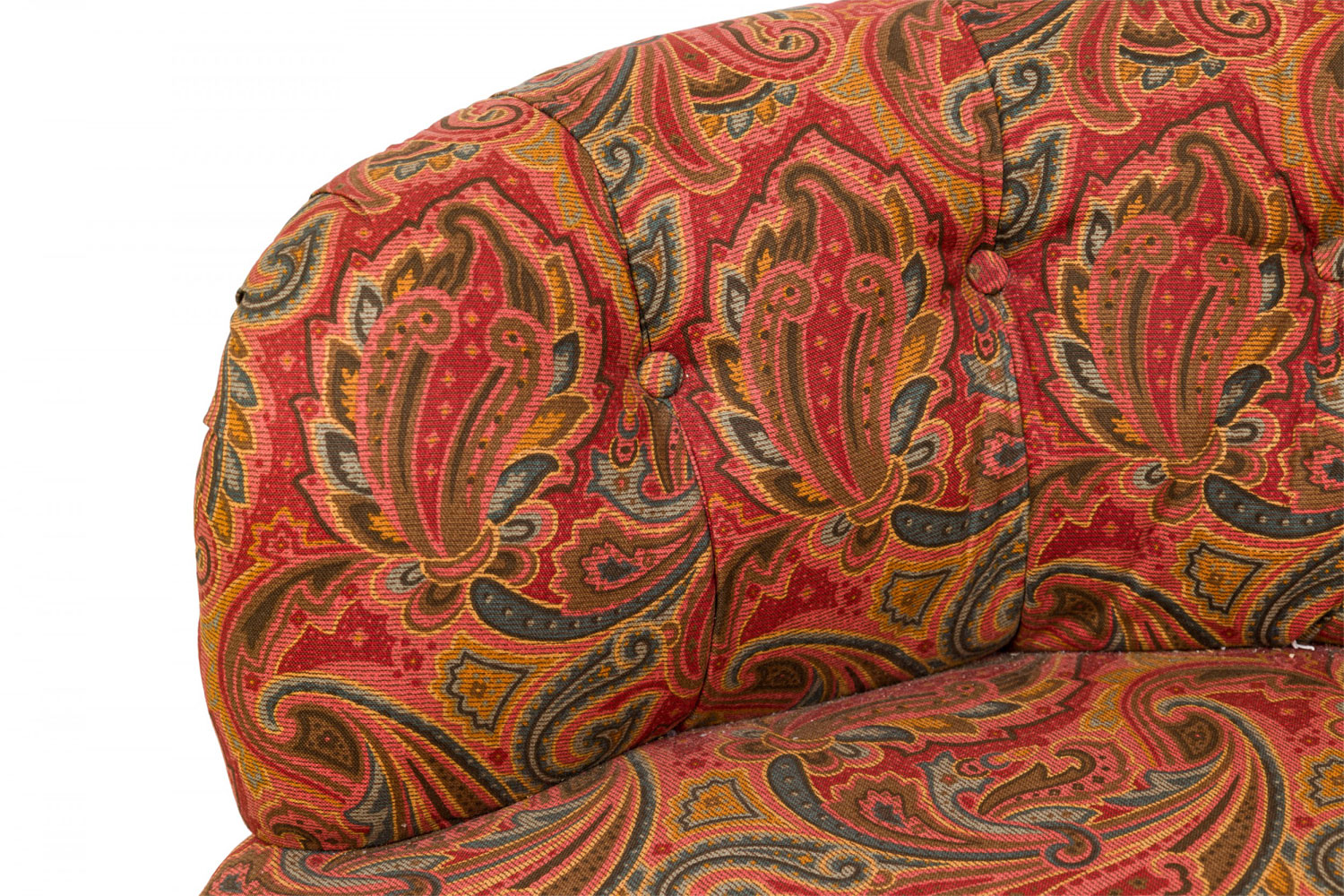 English Victorian Style Tufted Red and Blue Paisley Upholstered Rounded Back Loveseat
