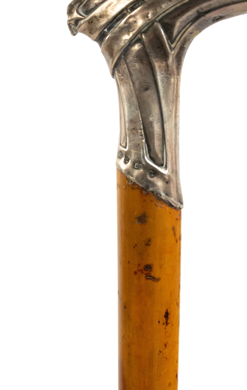 English Victorian light wood cane with silver fluted design handle with hallmarks at base..