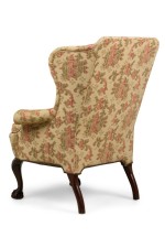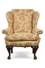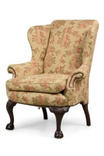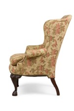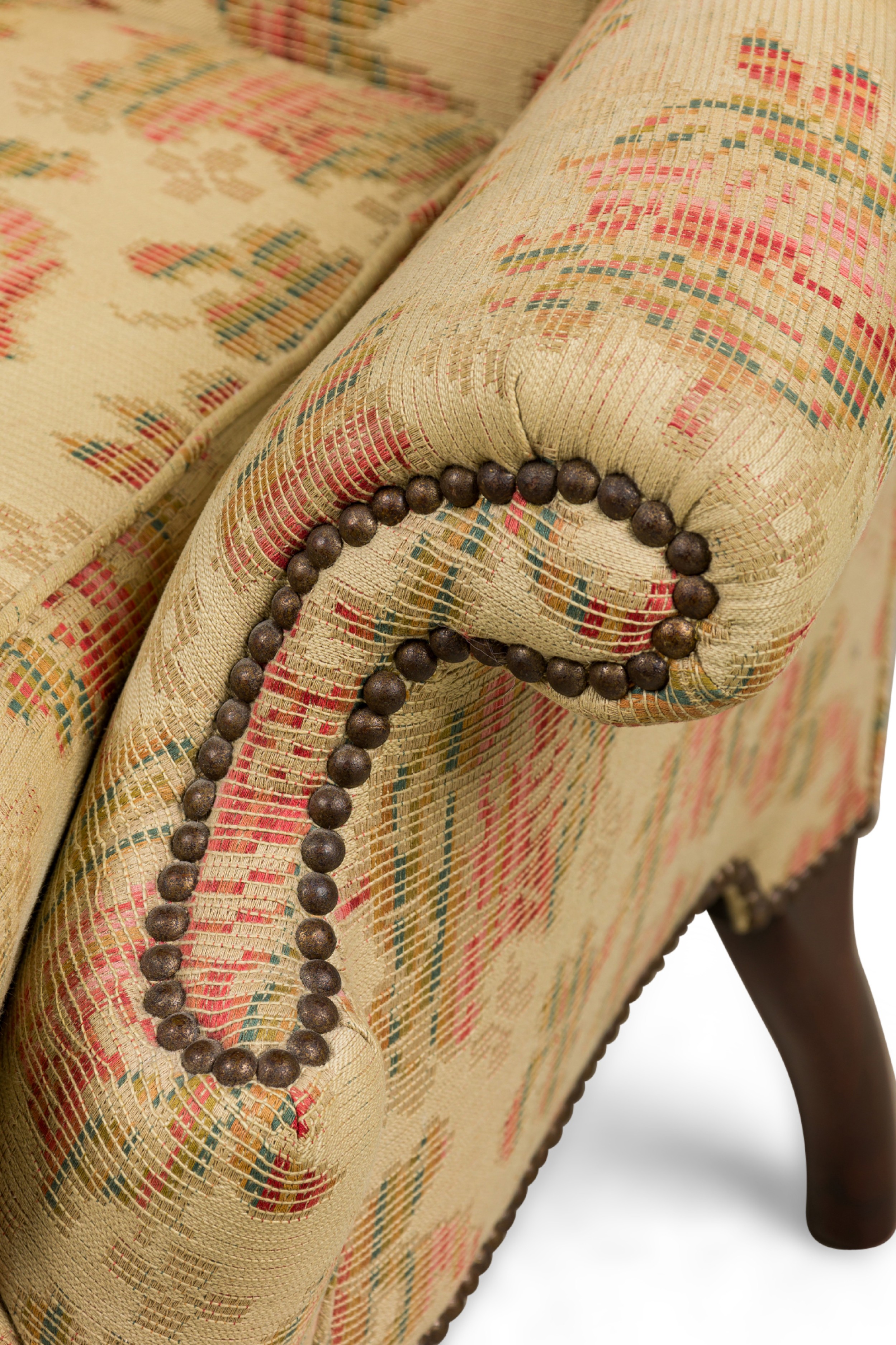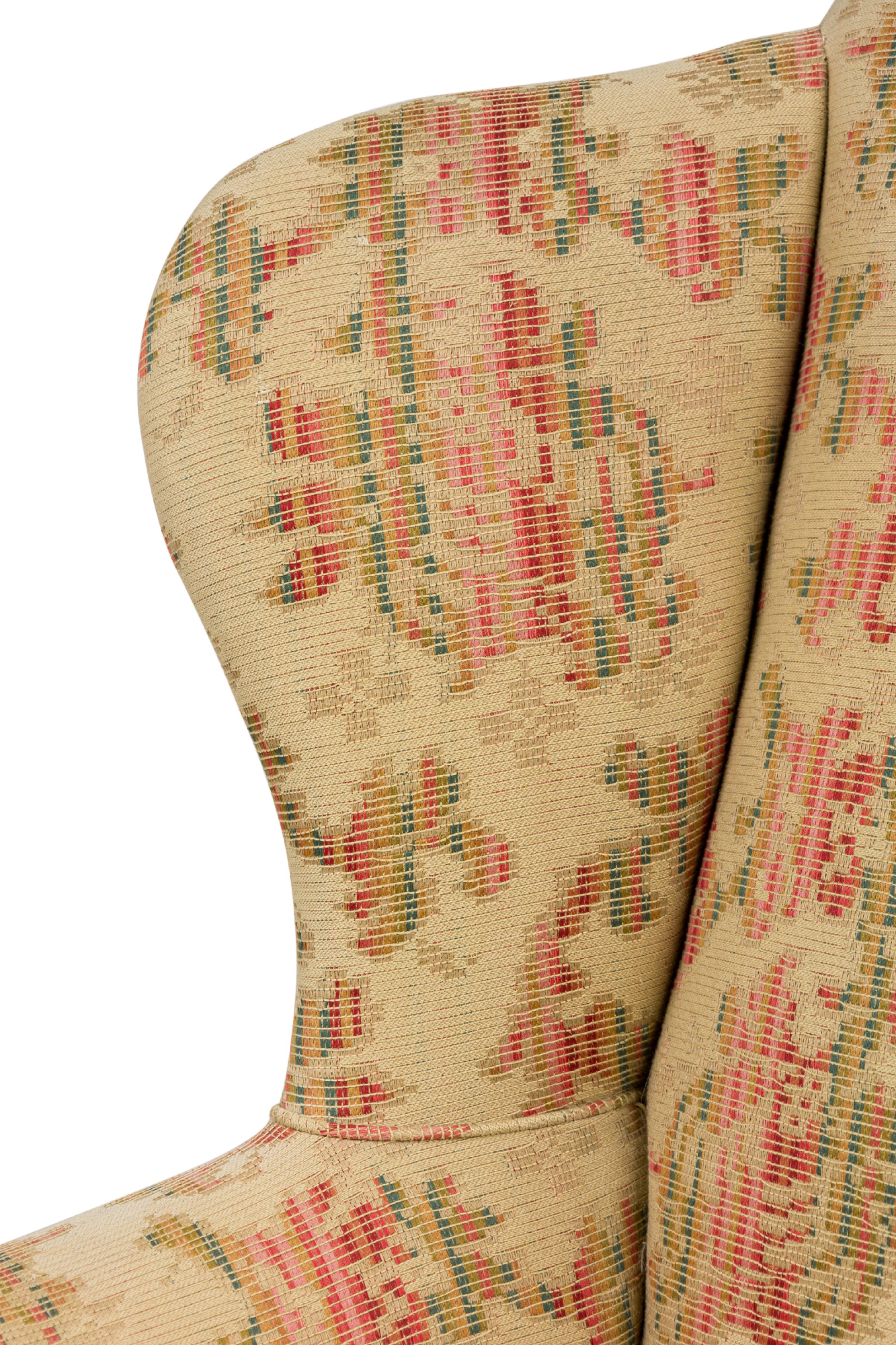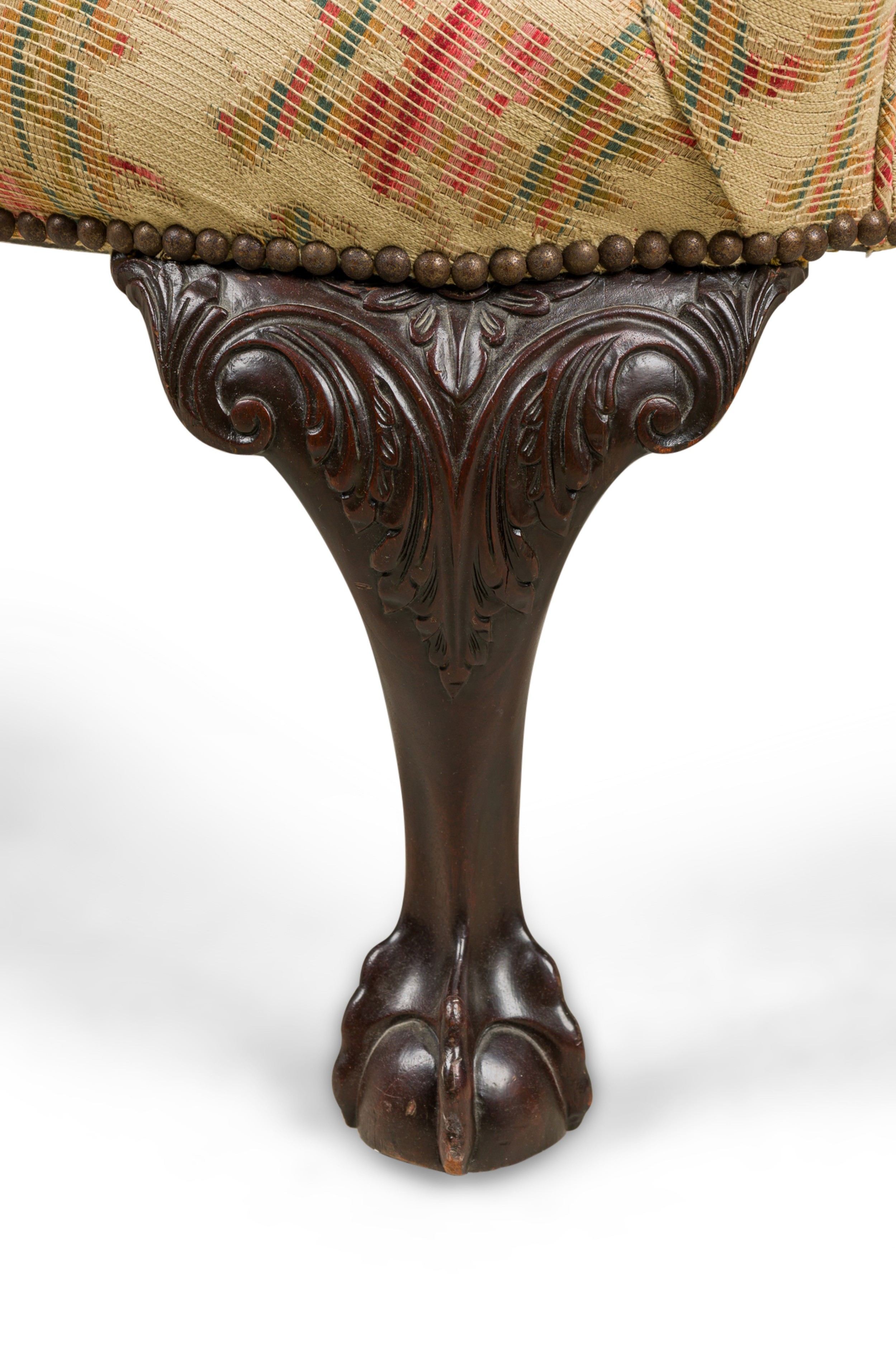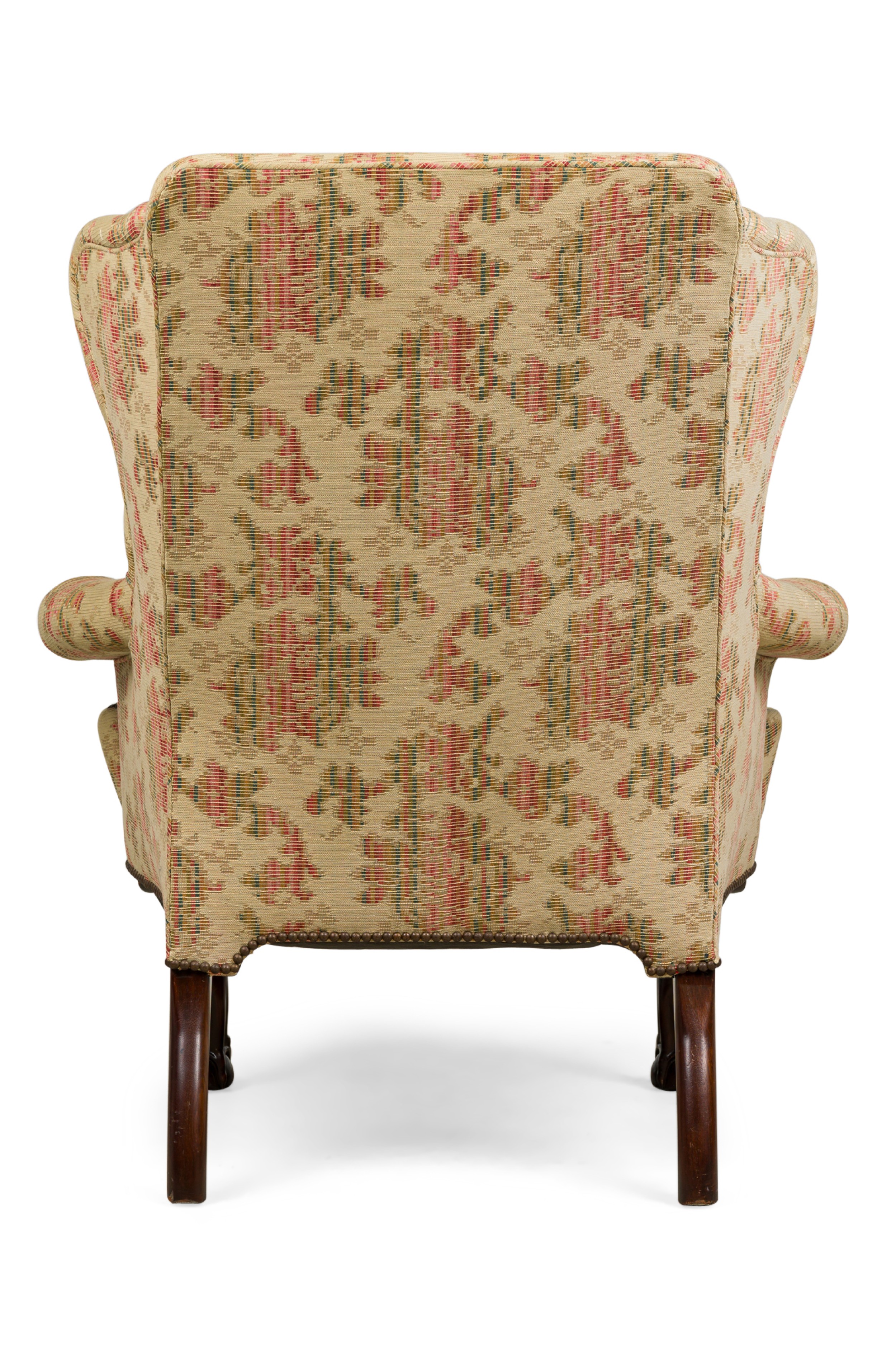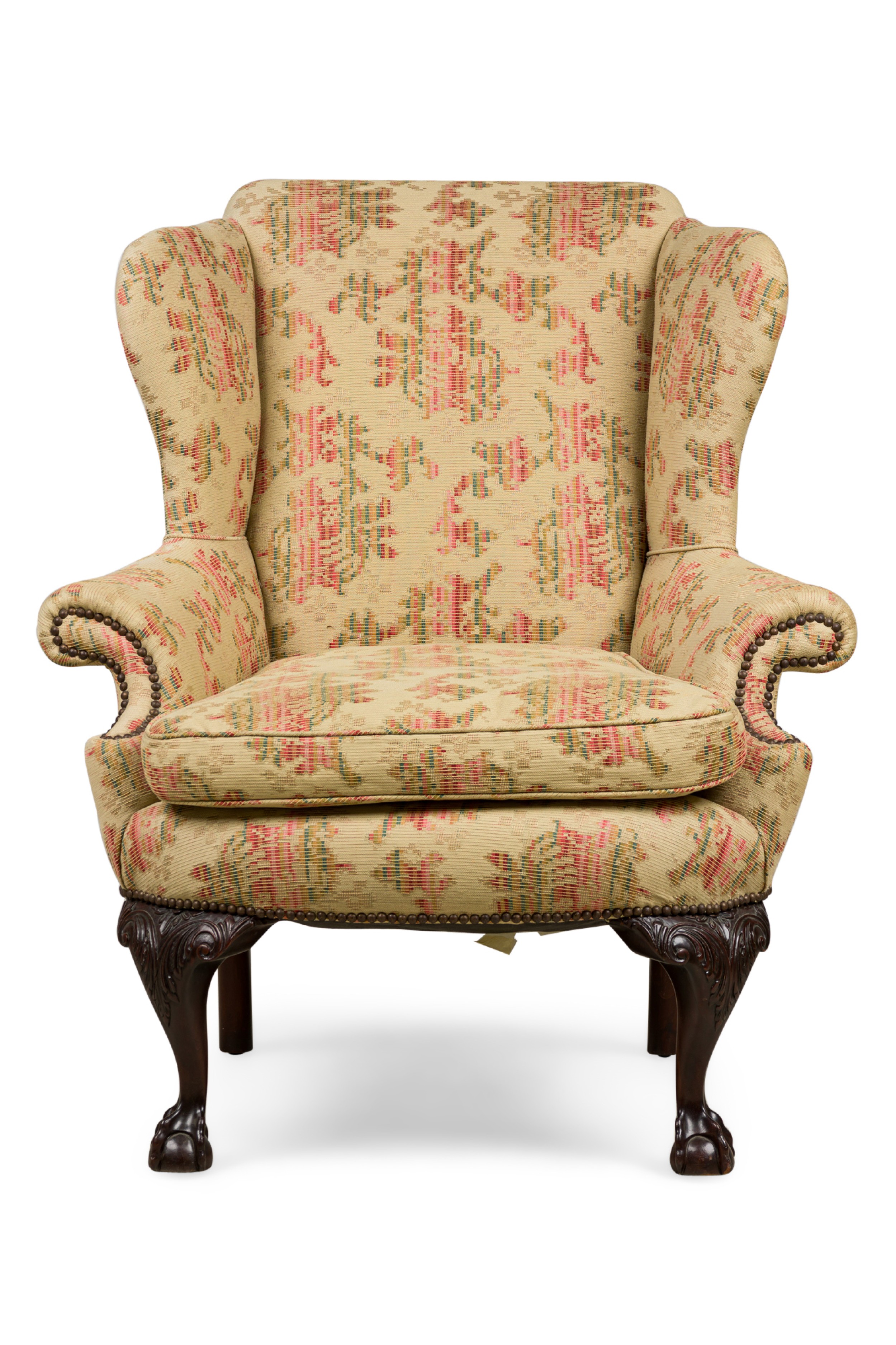 English Chippendale style (20th Century) wing chair with a beige floral pattern design and carved ball and claw front feet