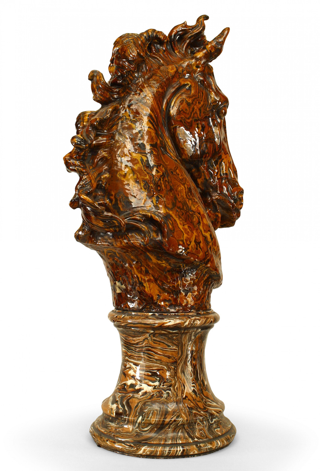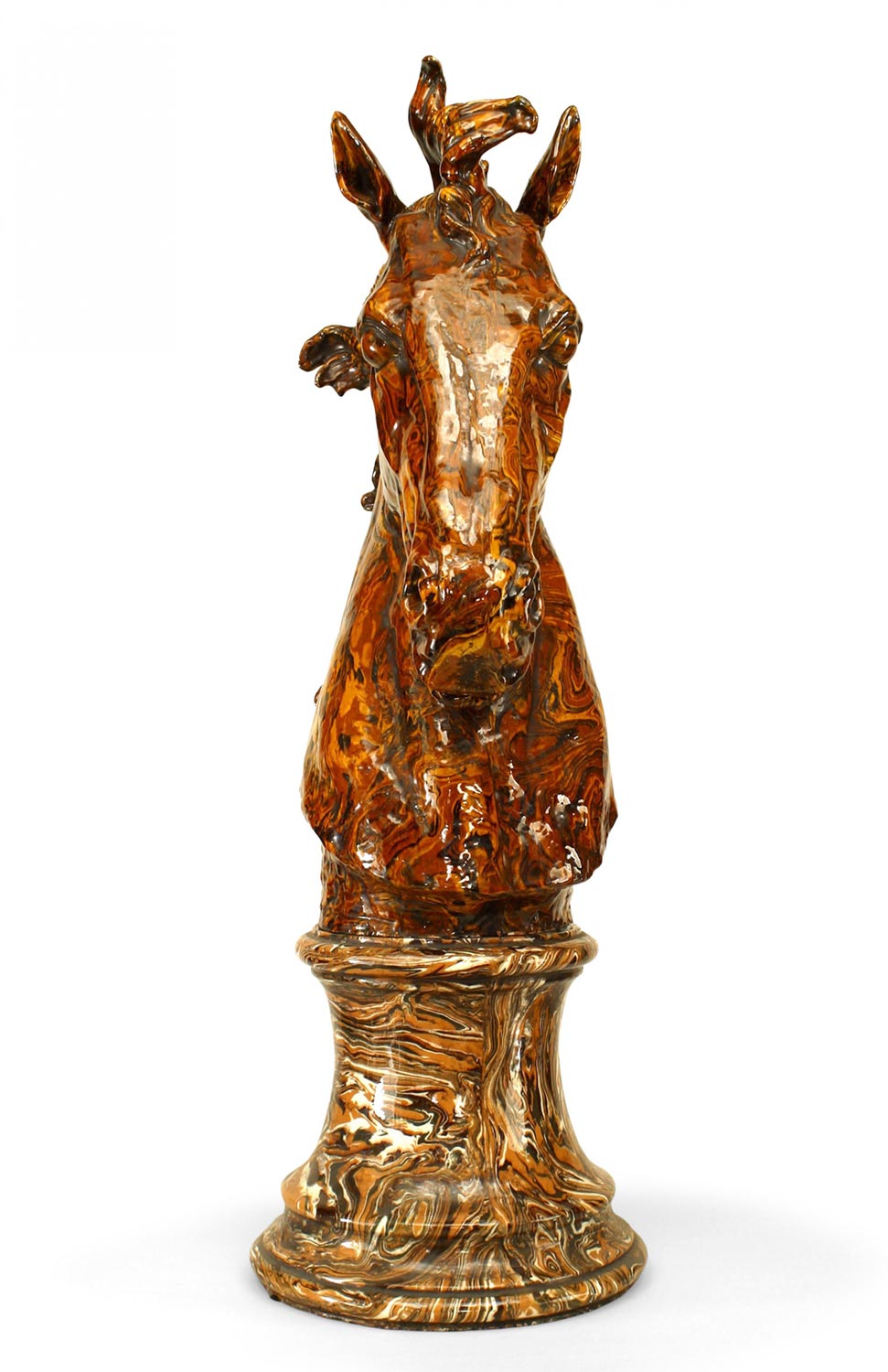 English Victorian brown marbleized glaze terra cotta life size horse head figure on round base (two sections).