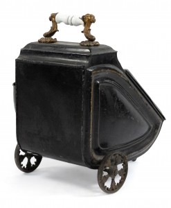 English Victorian tole coal scuttle on wheels with floral embroidered panels and white opaline handle.
