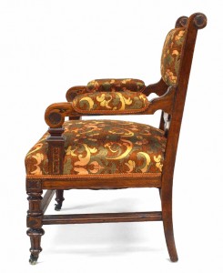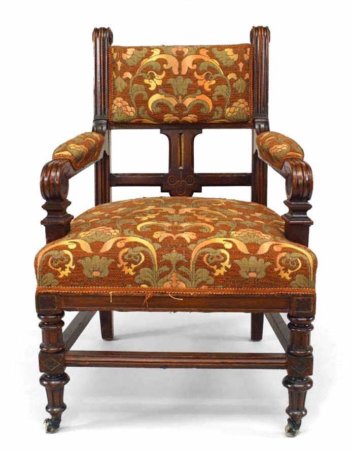 English Victorian walnut square back arm chair with stretcher and brown tapestry upholstery.