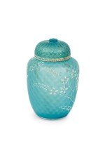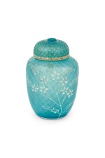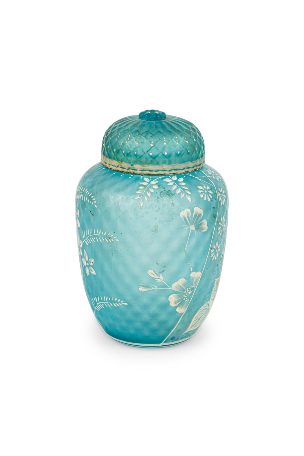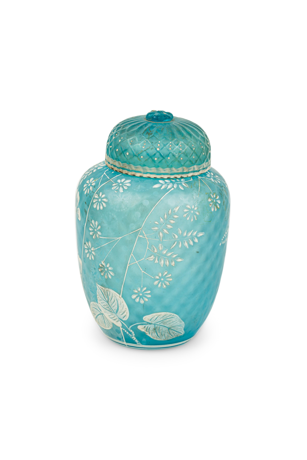 English Victorian (Webb) style blue glass vase with cover and white cameo floral decoration..