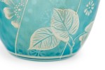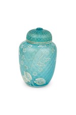 English Victorian (Webb) style blue glass vase with cover and white cameo floral decoration.