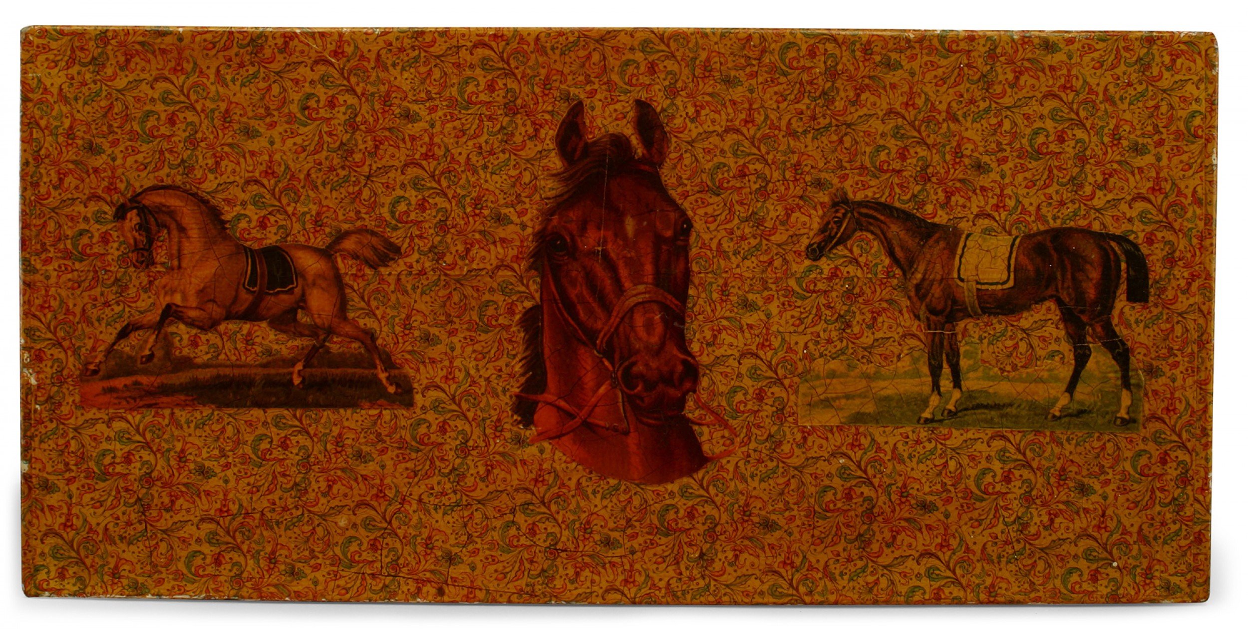 English Victorian-style wood decorated box with horse heads and horses.