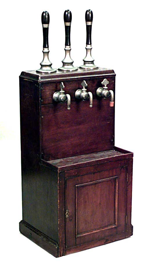 English Victorian wooden beer pub engine with 3 black and pewter handles and shelf (Gashall & Chambers, London).