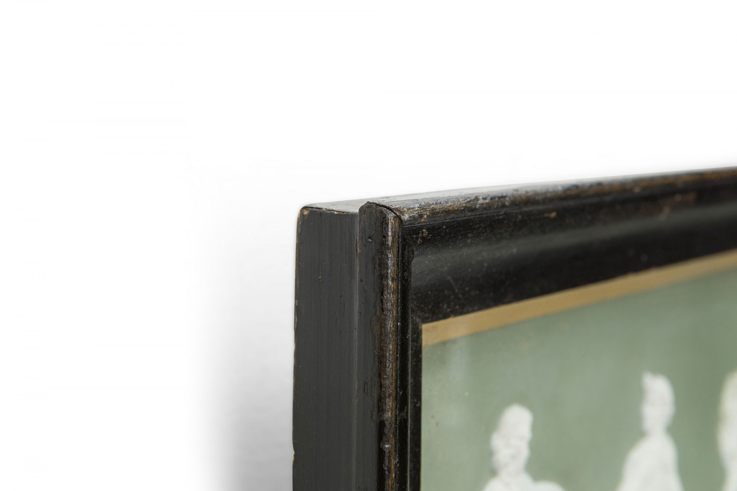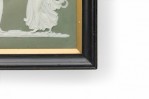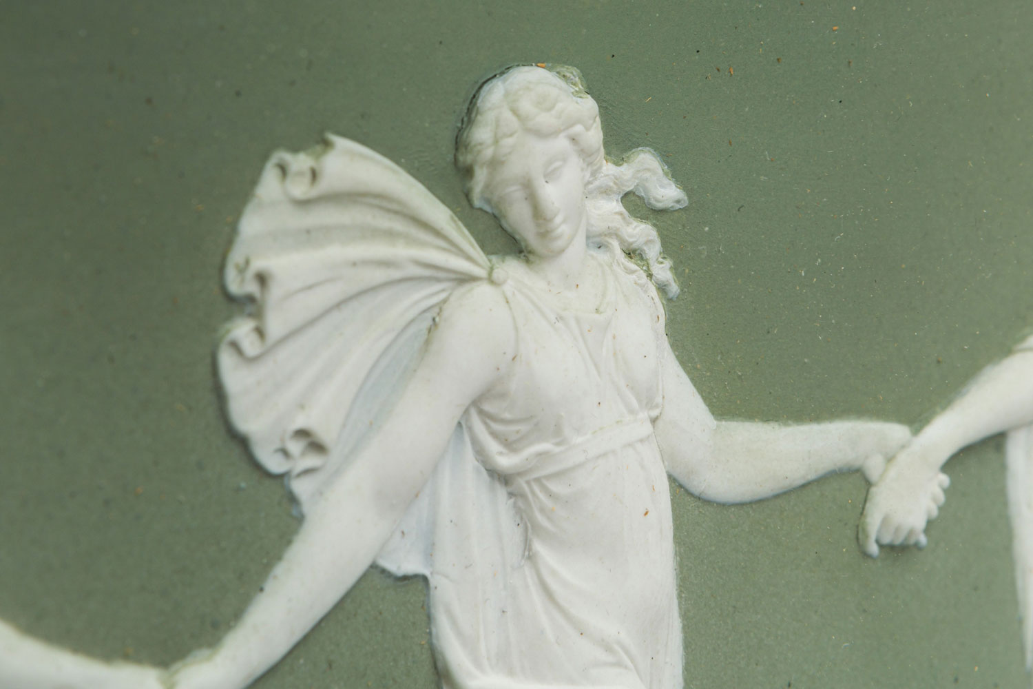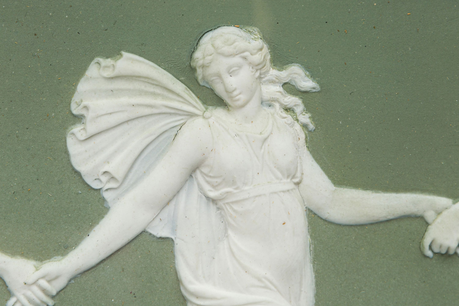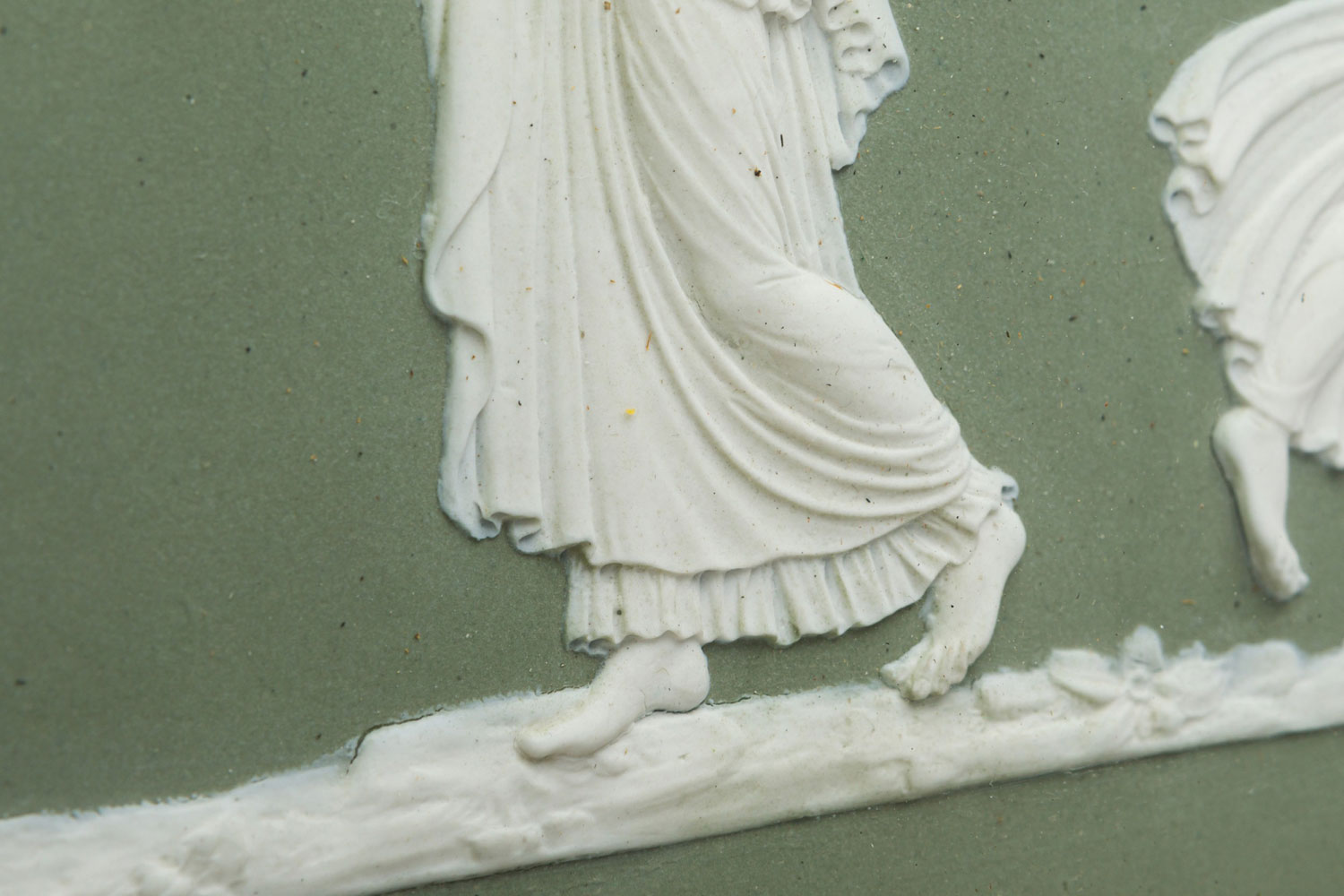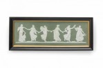 English Wedgwood (19th Century) rectangular horizontal green and white porcelain wall plaque with 6 maidens.