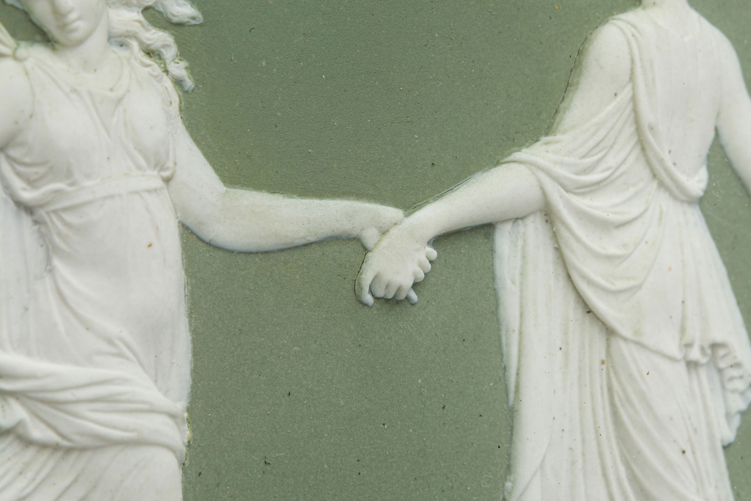 English Wedgwood (19th Century) rectangular horizontal green and white porcelain wall plaque with 6 maidens..